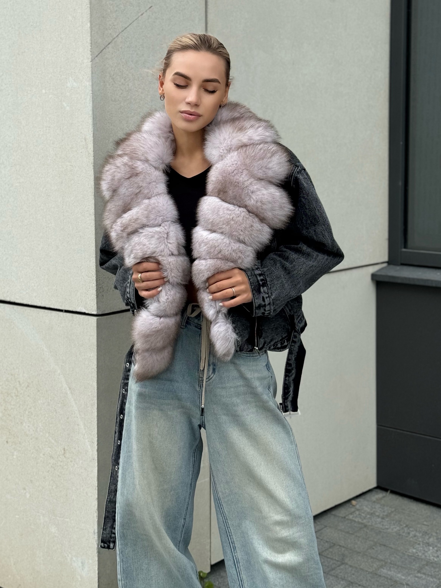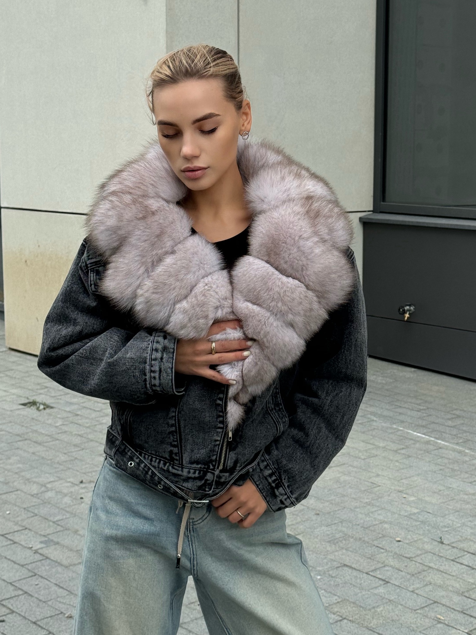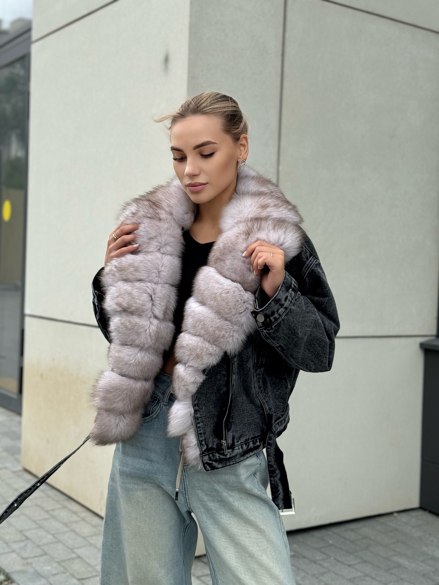 Джинсовая куртка графит с мехом песца