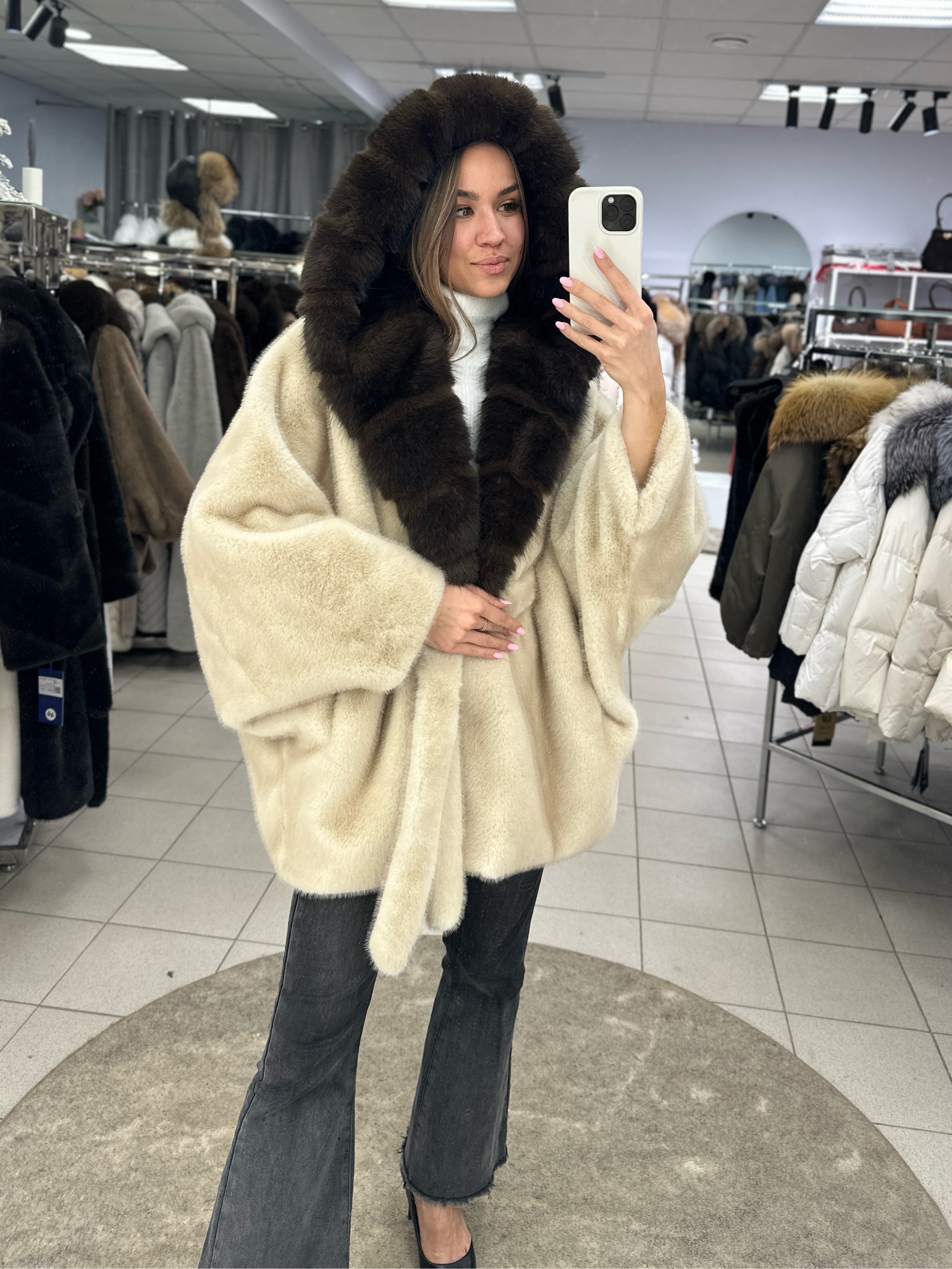 Эко - шуба норка «летуча мышь» в цвете «пломбир» с капюшоном