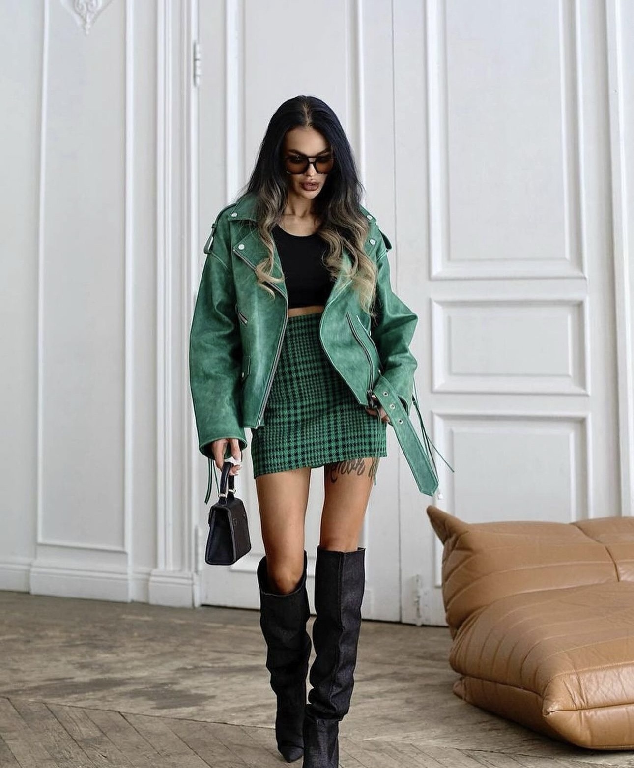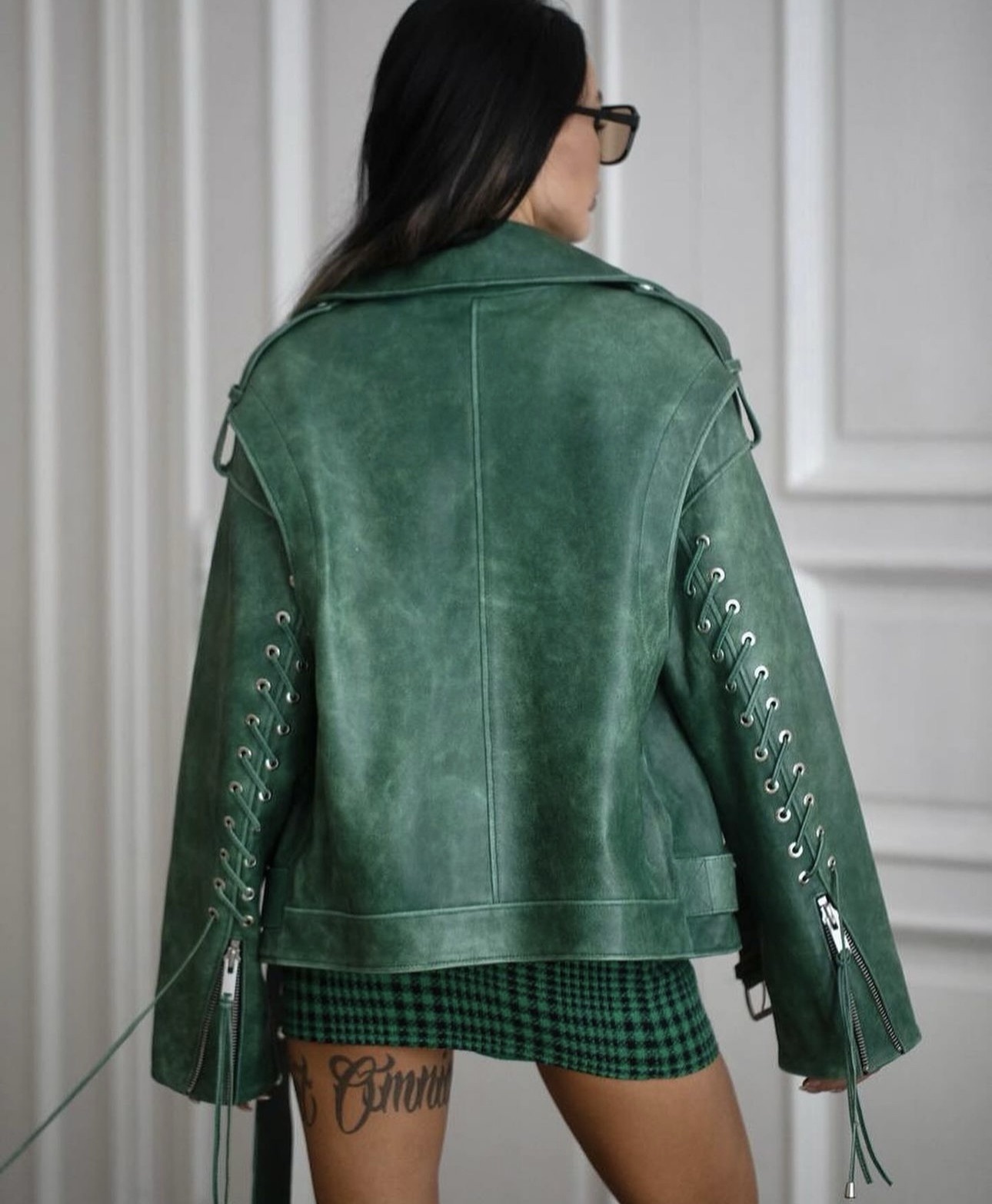 Кожаная куртка «изумруд» со шнуровкой на рукавах