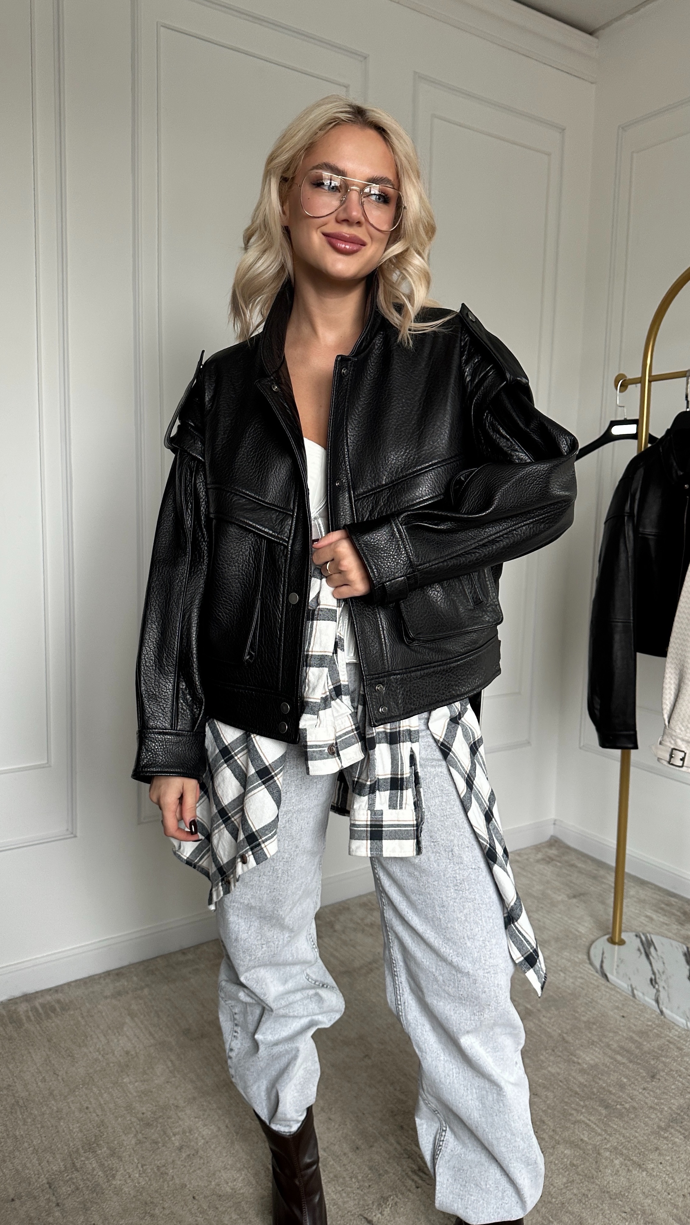 Кожаный бомбер с накладными карманами