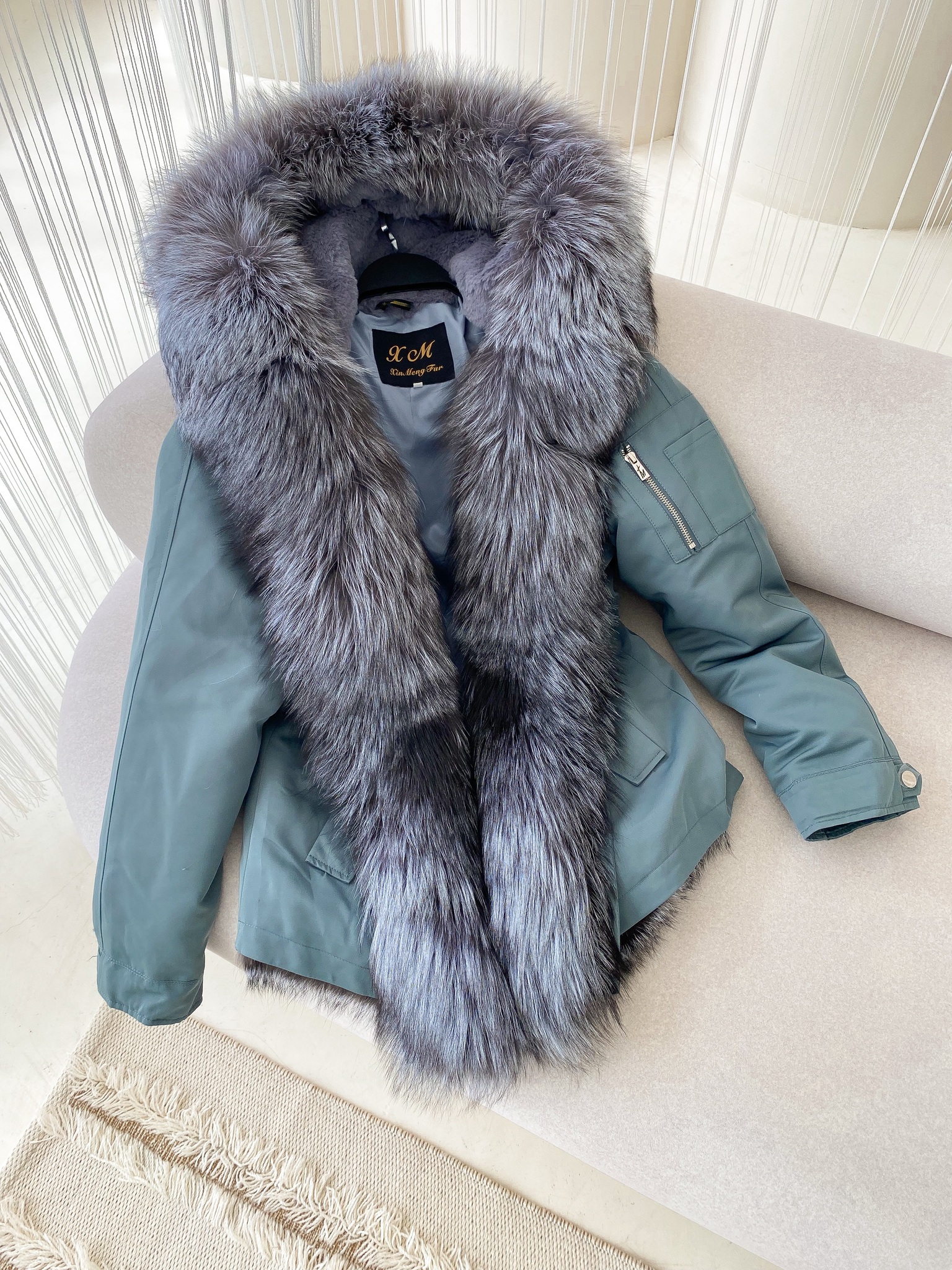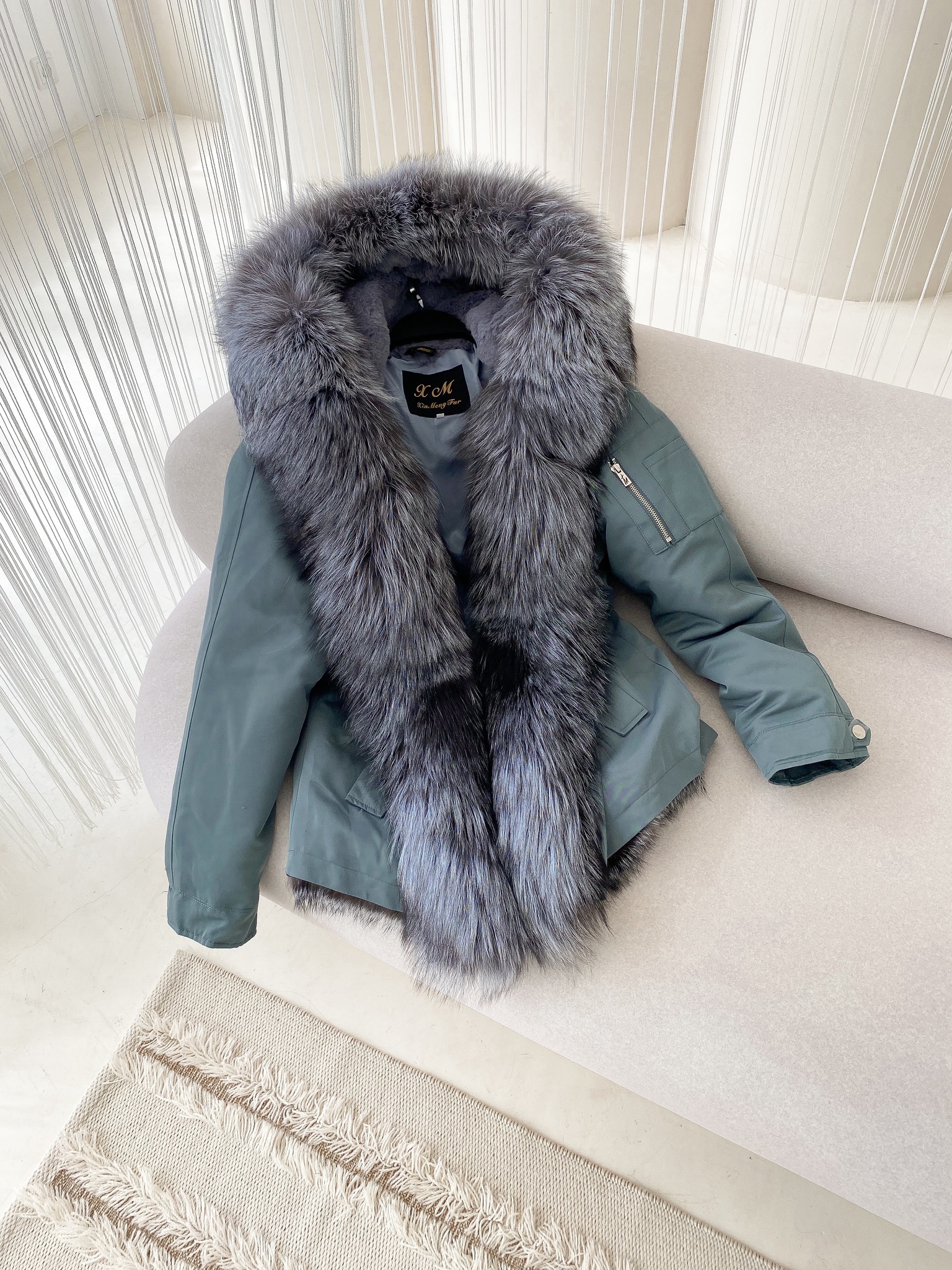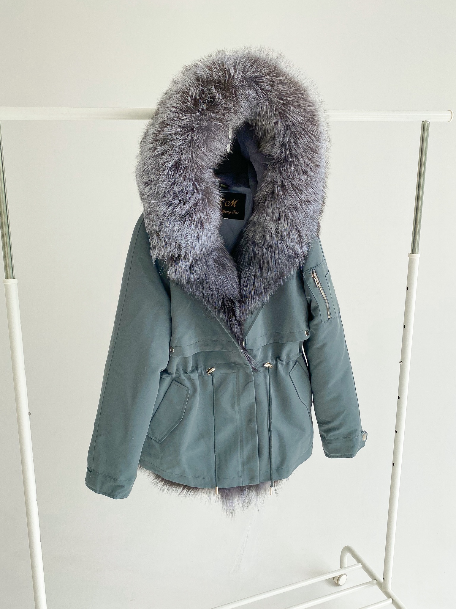 Парка в цвете «морская волна» с цельным мехом чернобурки