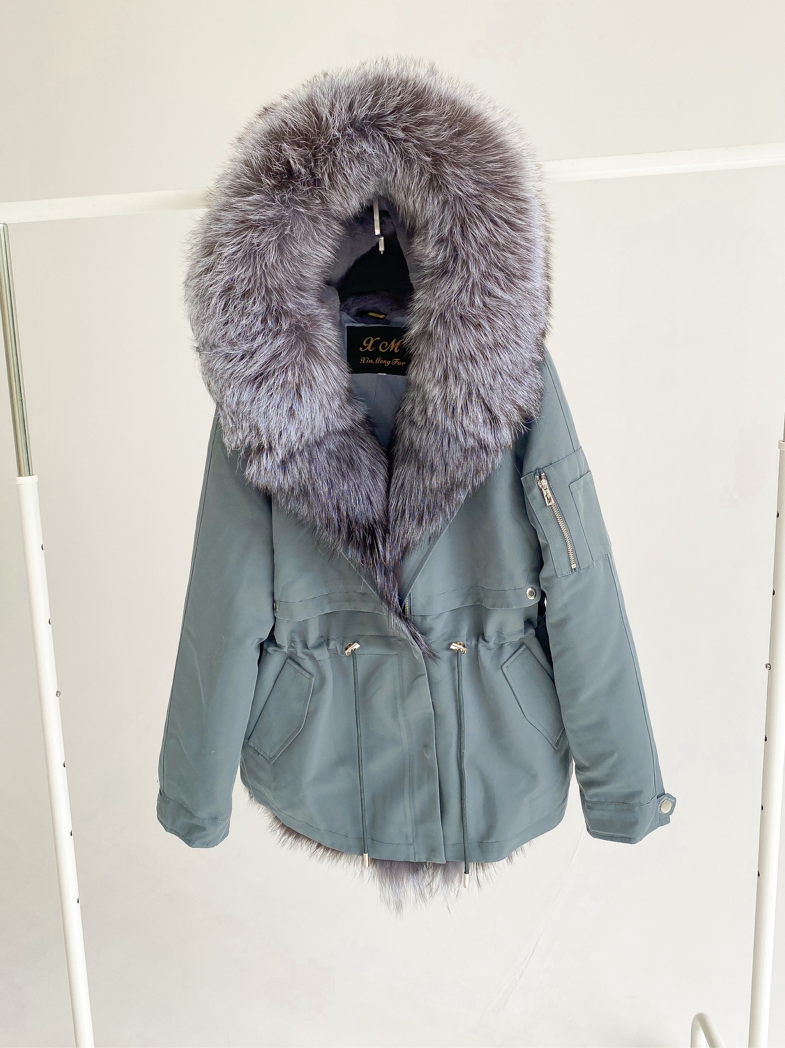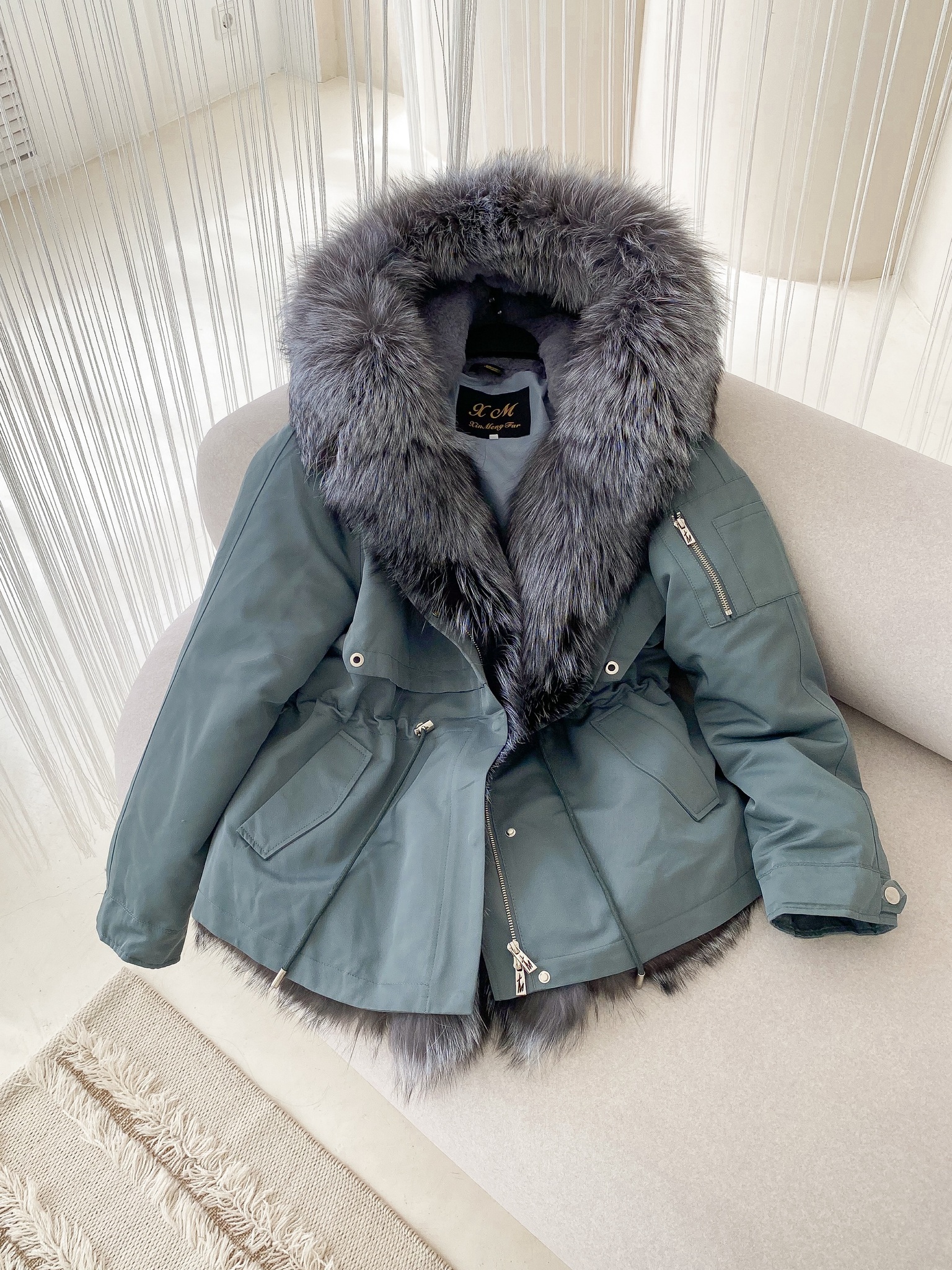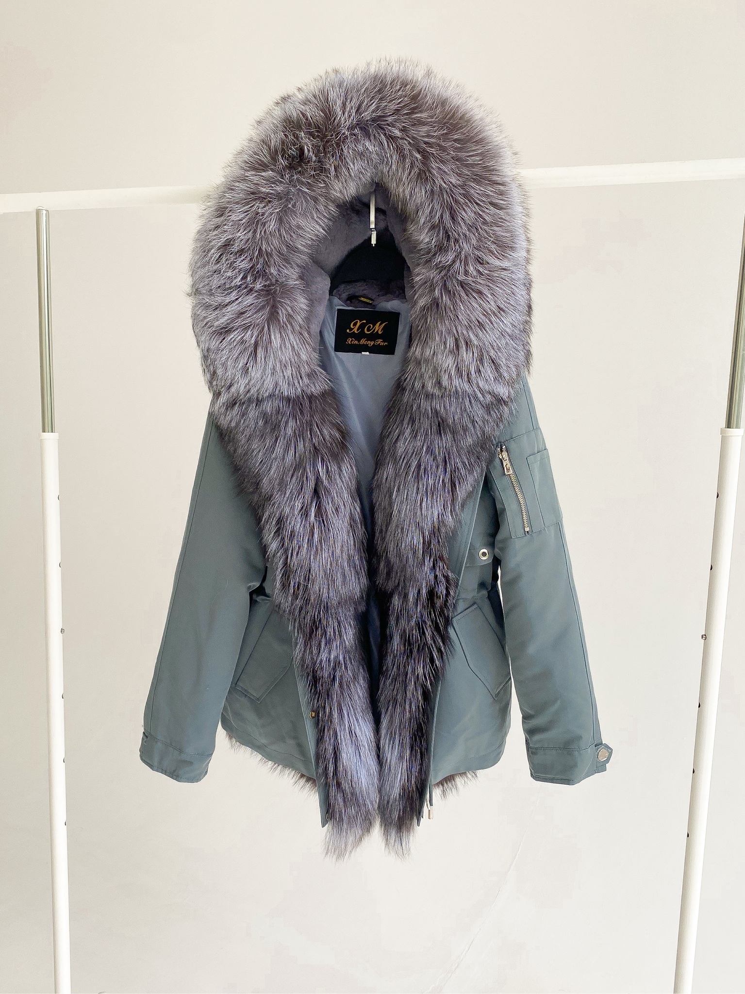Парка в цвете «морская волна» с цельным мехом чернобурки