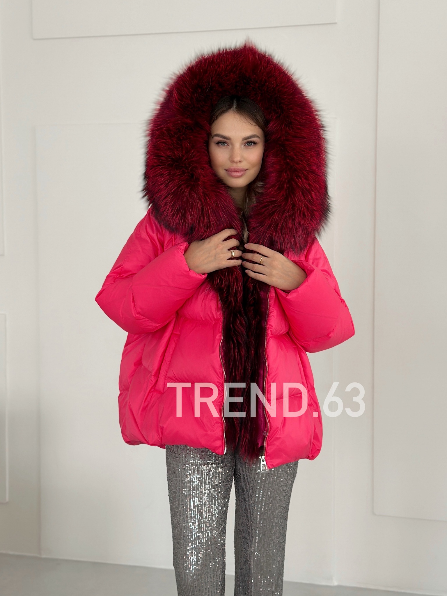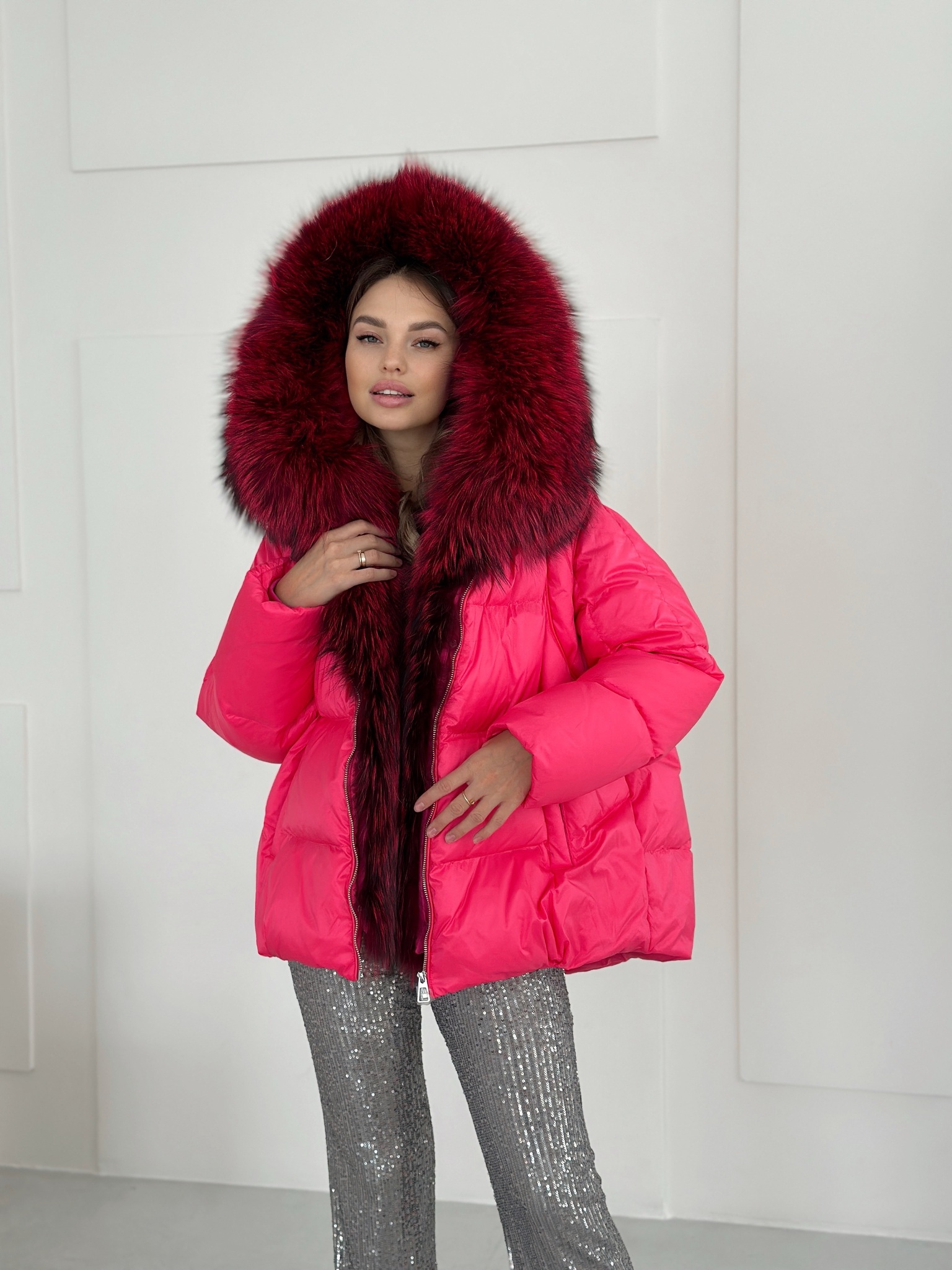 Пуховик «фуксия» с мехом енота