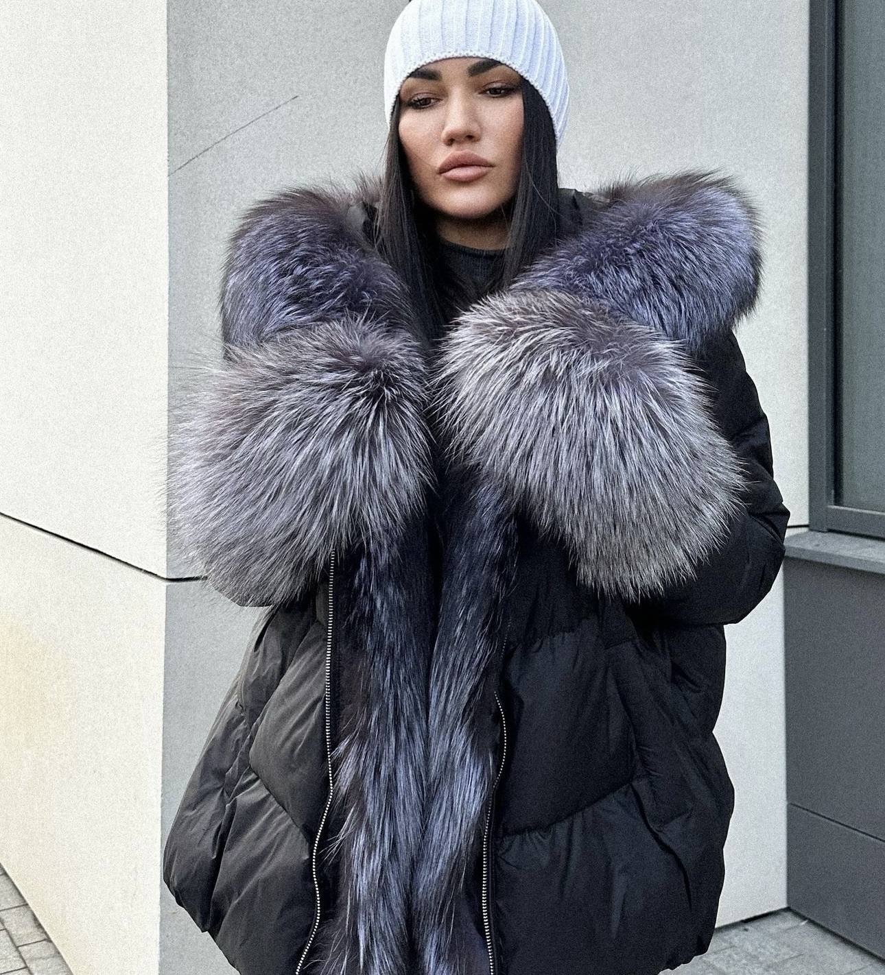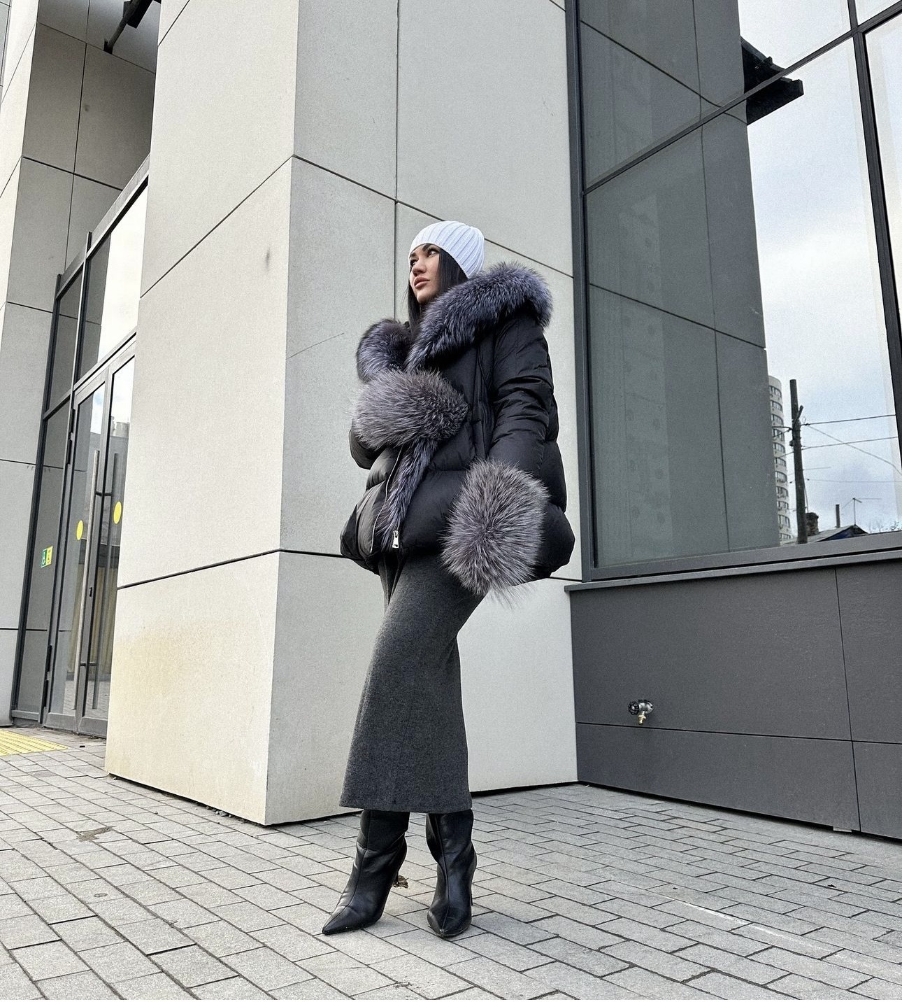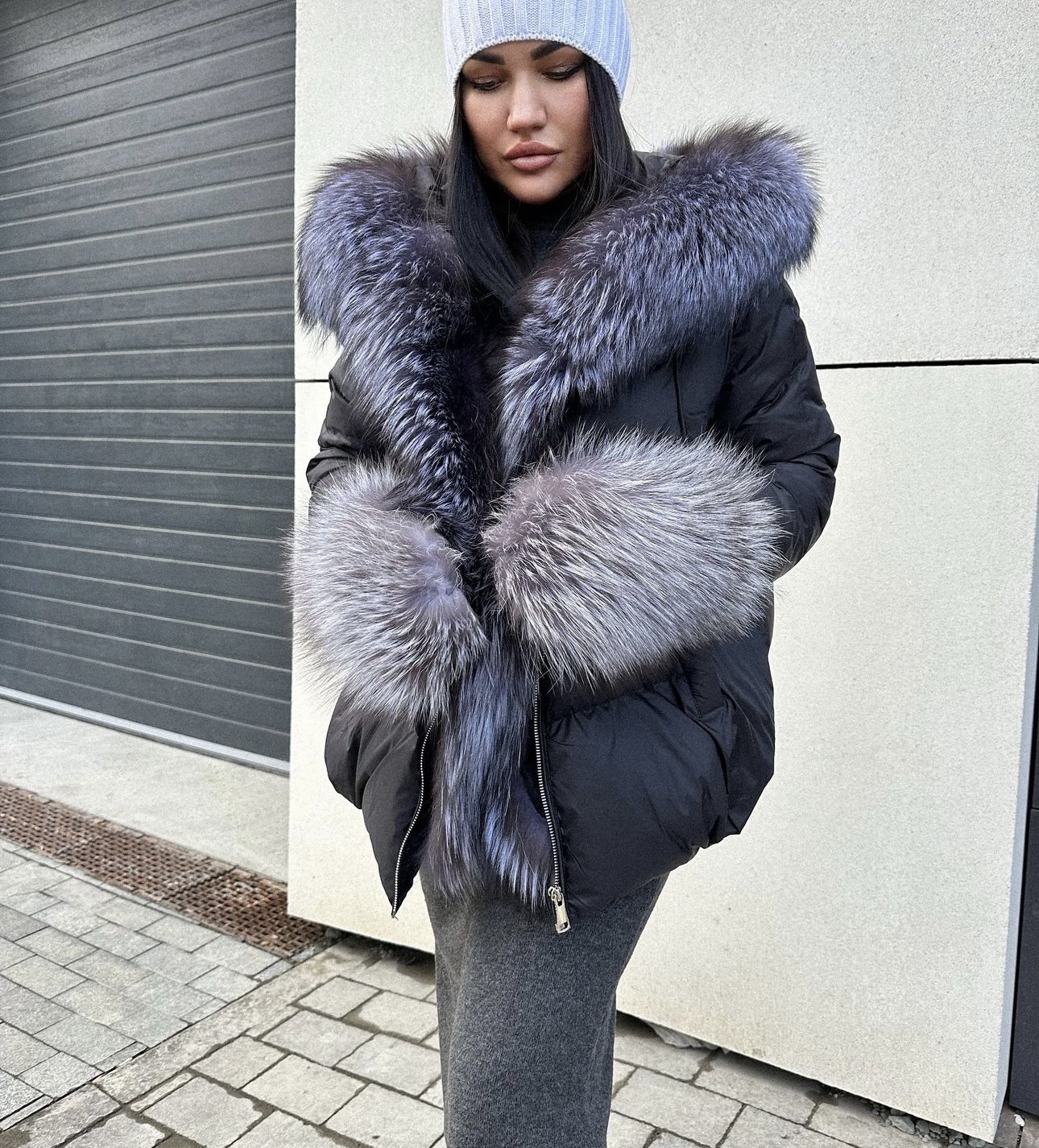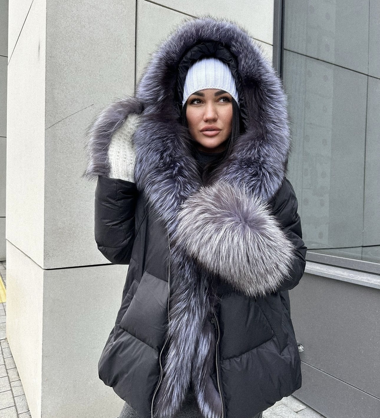 Состав: 90% пух, 10% перо. -100% натуральный мех серебристой чернобурки; -мех съемный, можно носить мехом наружу (есть фиксаторы); -застежка - молния; -карманы прорезные; капюшон; модель - бомбер; длина 73-78 см.