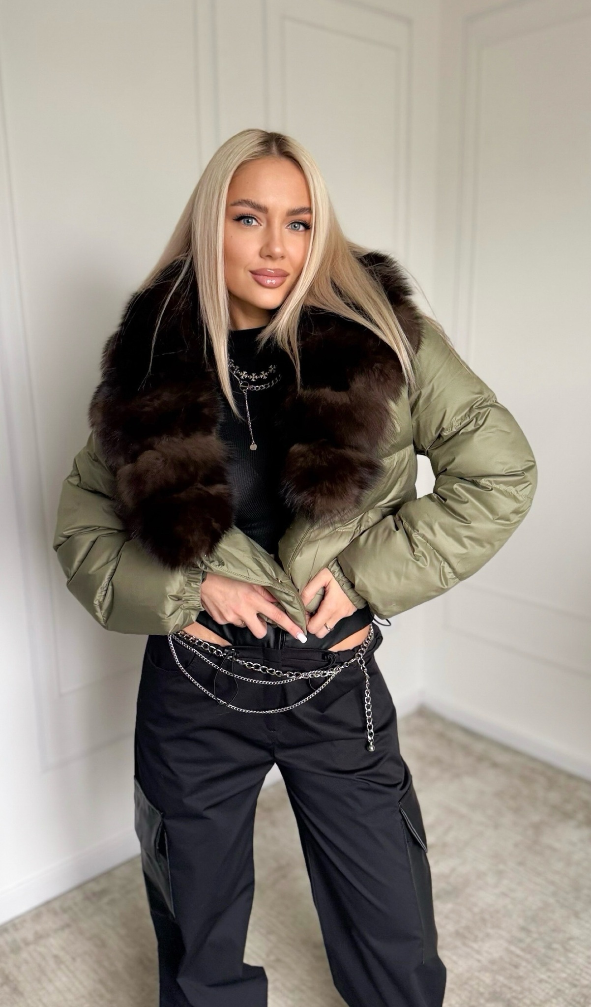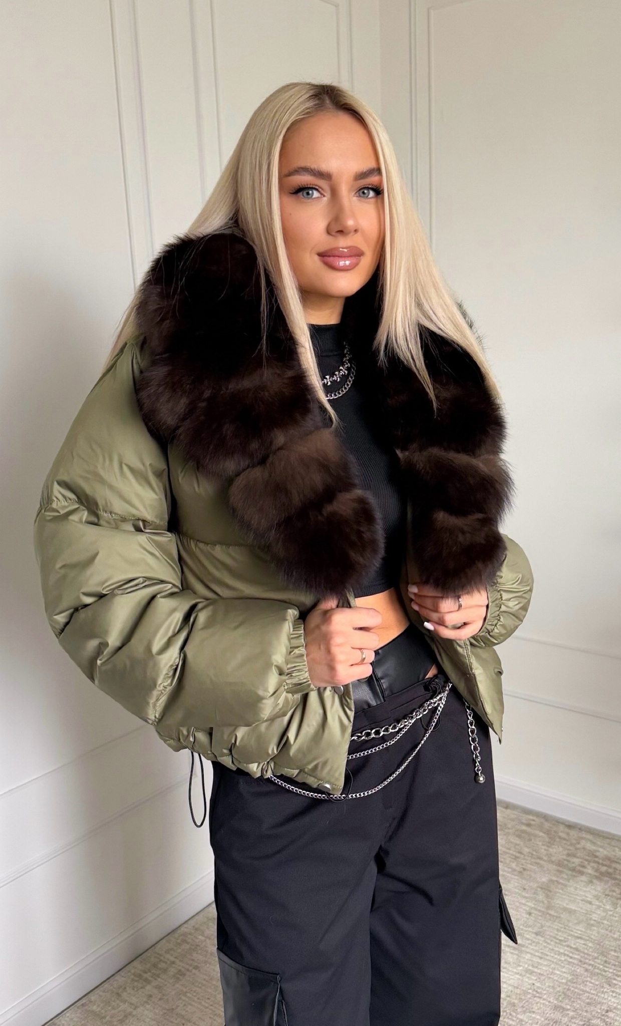 Пуховик - бомбер в цвете «олива» с мехом финского песца под «соболь»