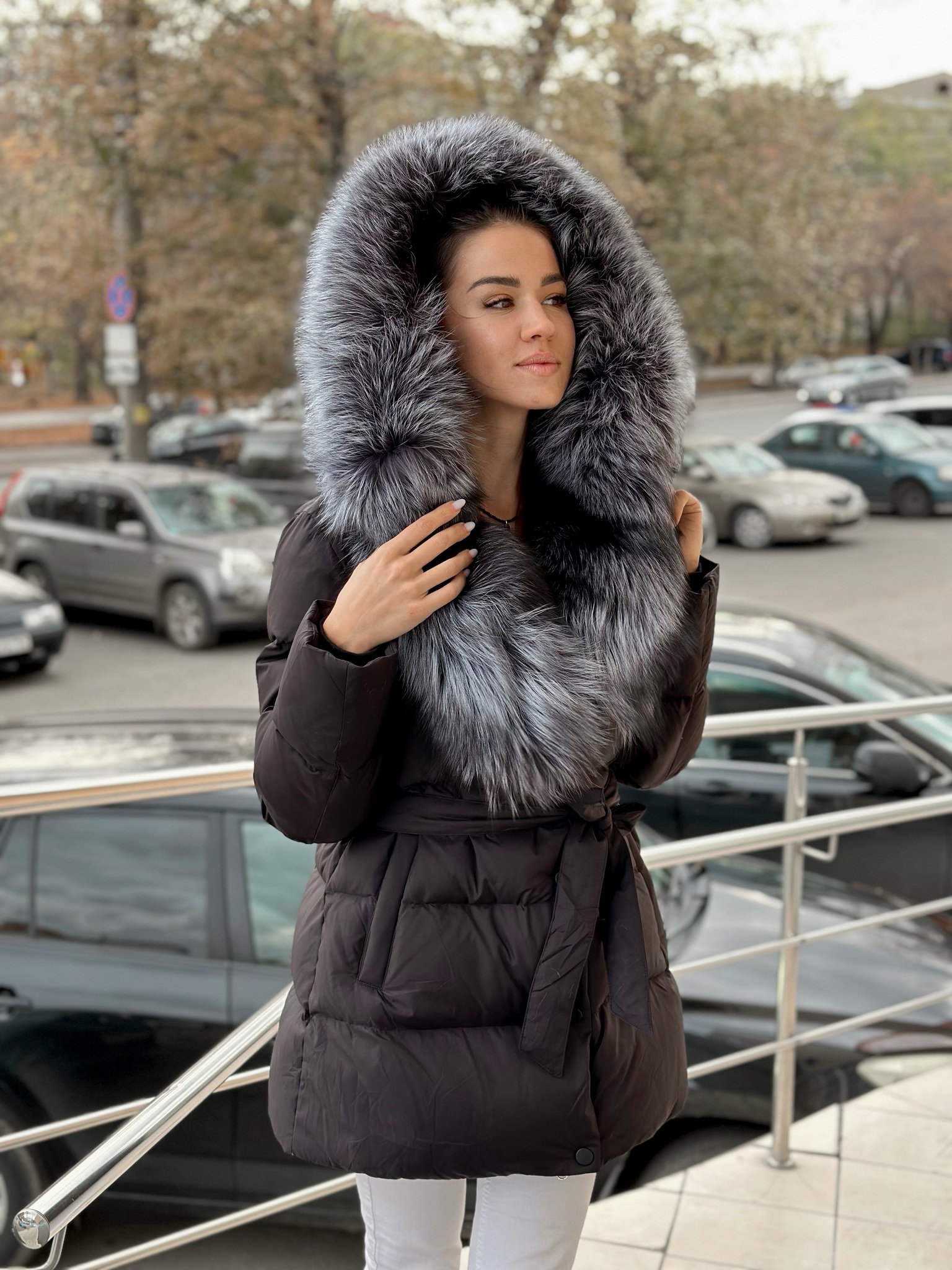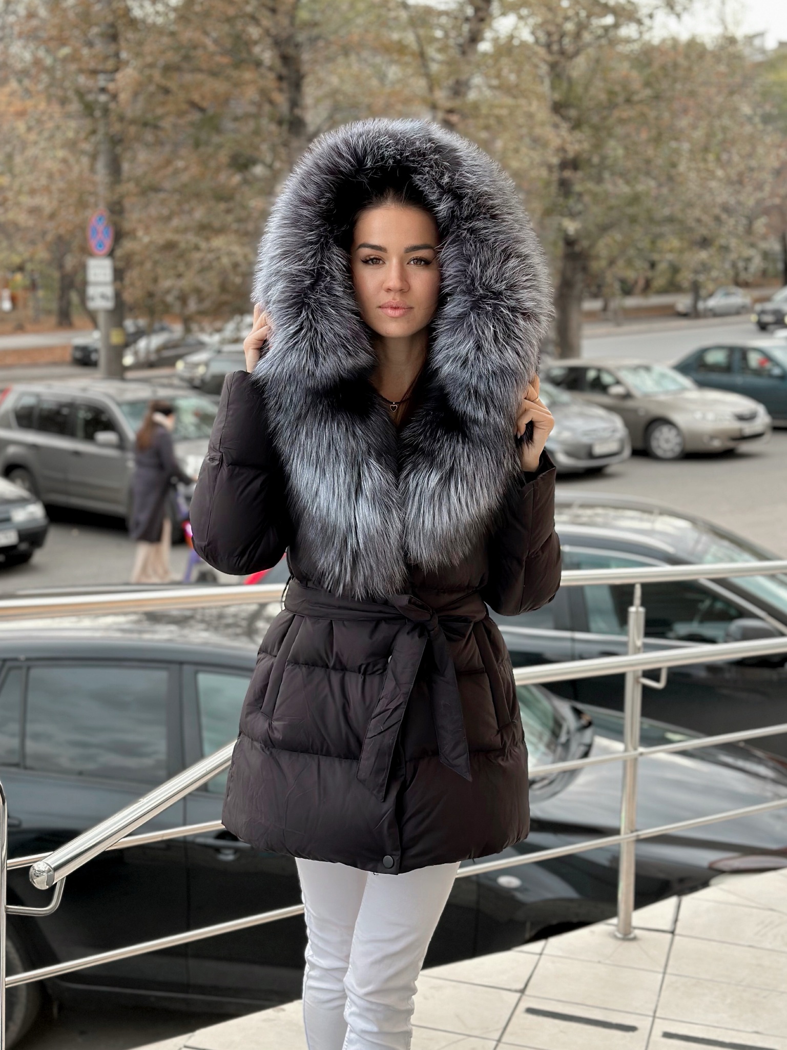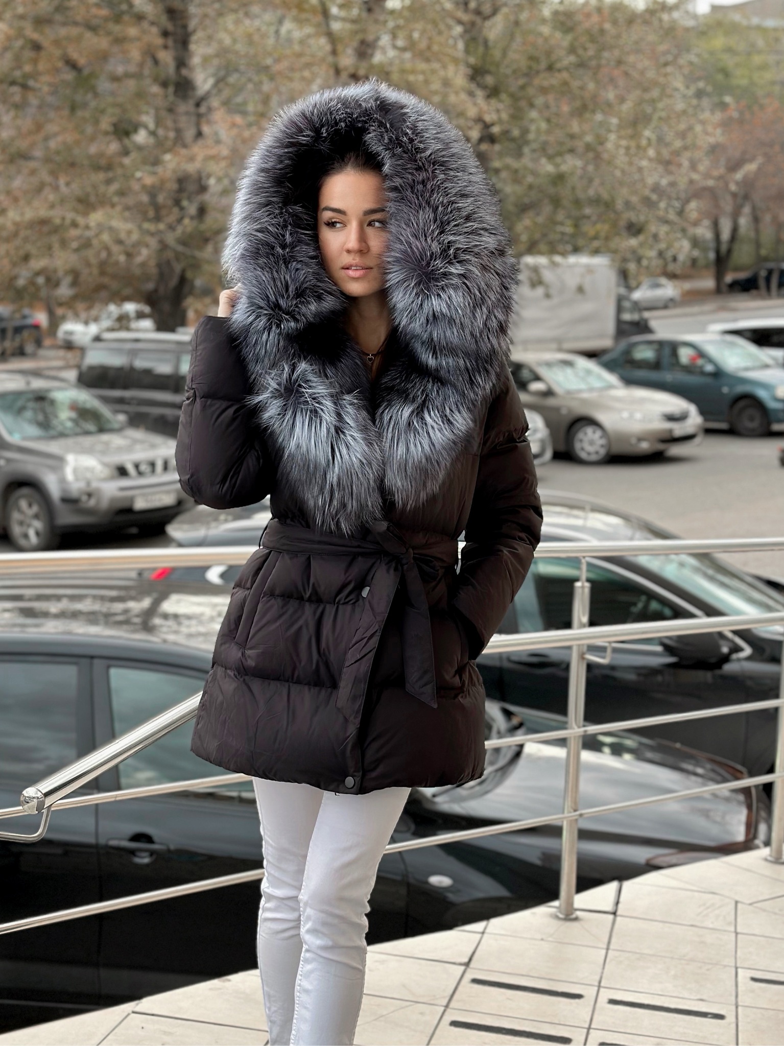 Пуховик с мехом песца «черный бриллиант» 75 см с поясом