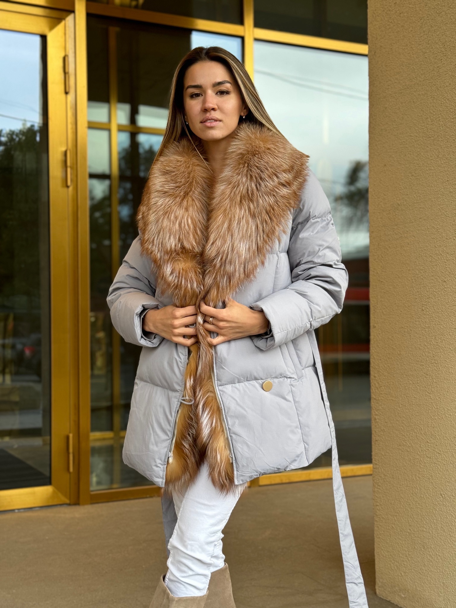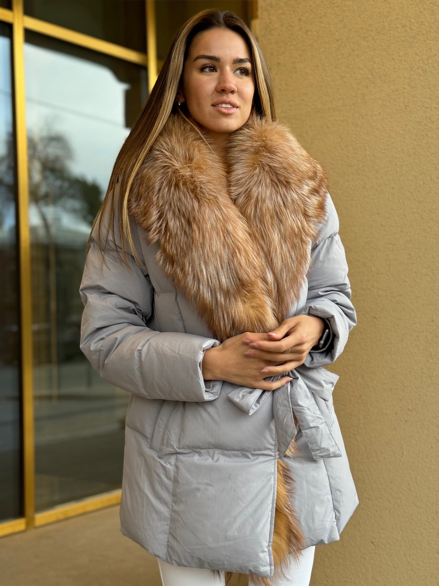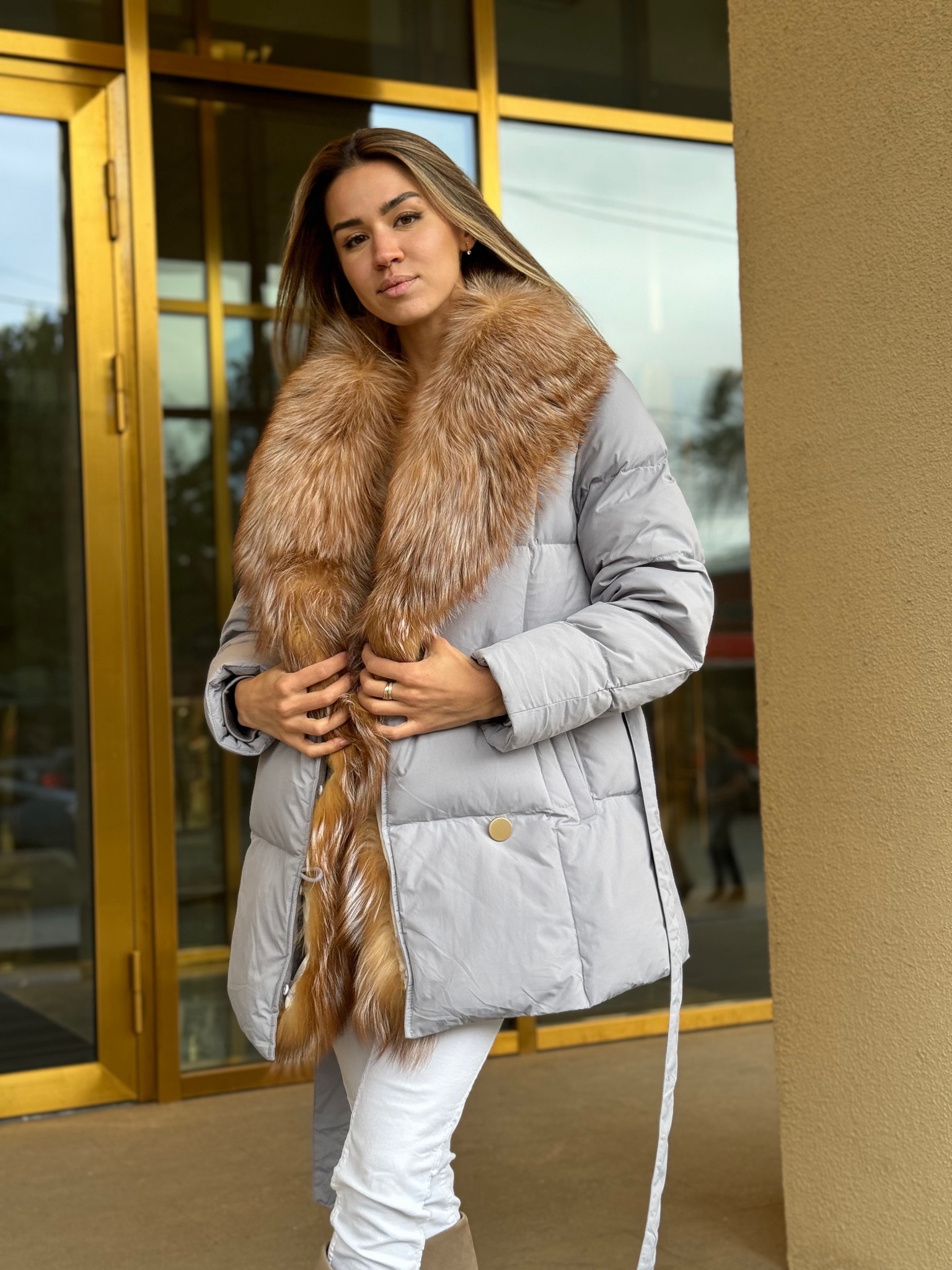 Пуховик с поясом в длине 75см с мехом лисы «огневки»