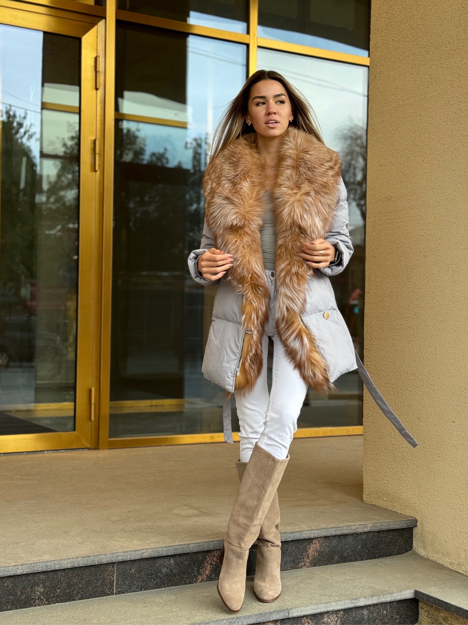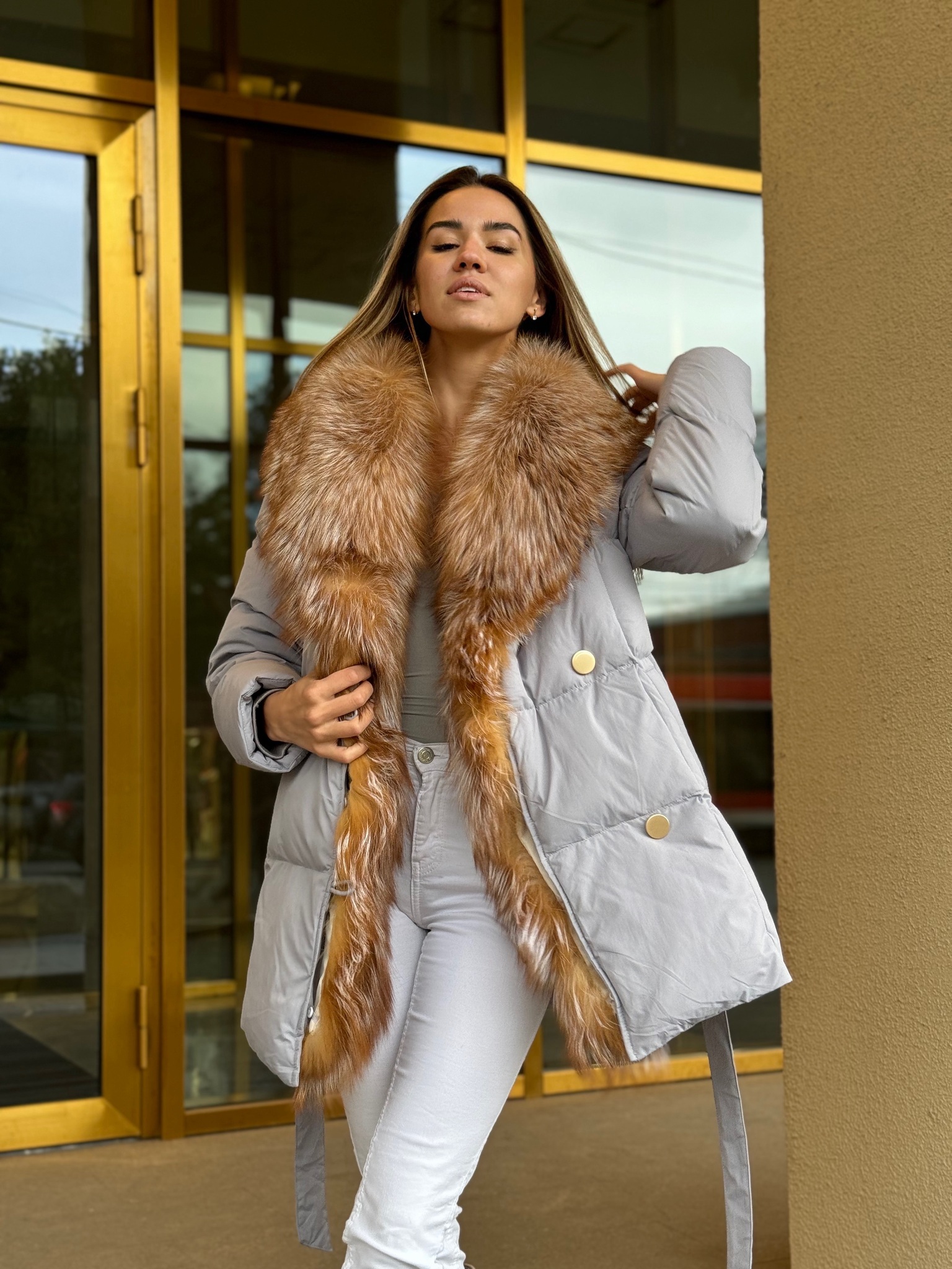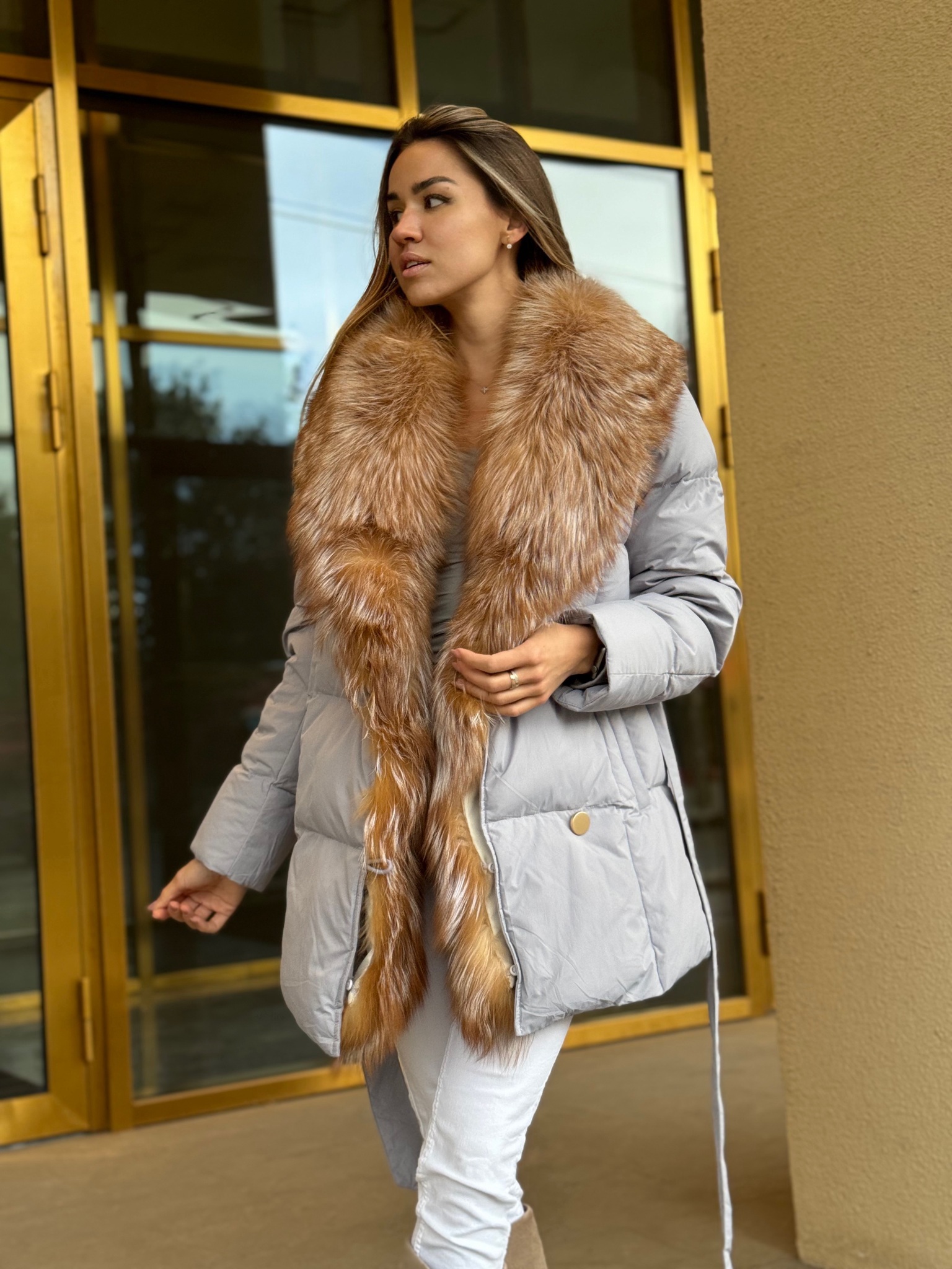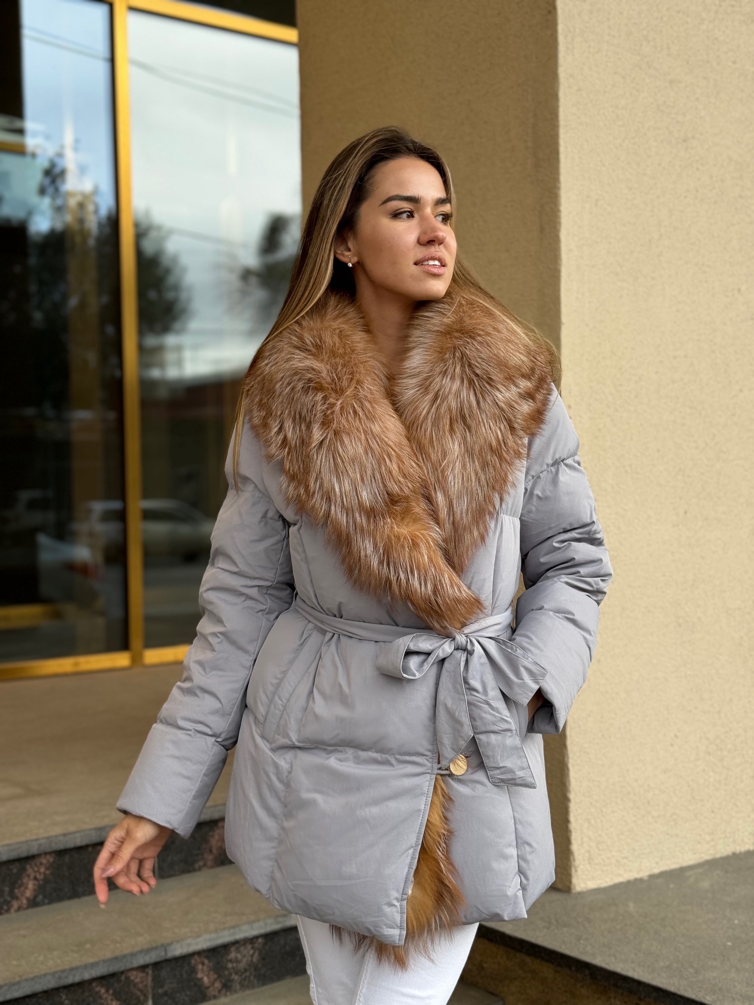 Пуховик с поясом в длине 75см с мехом лисы «огневки»