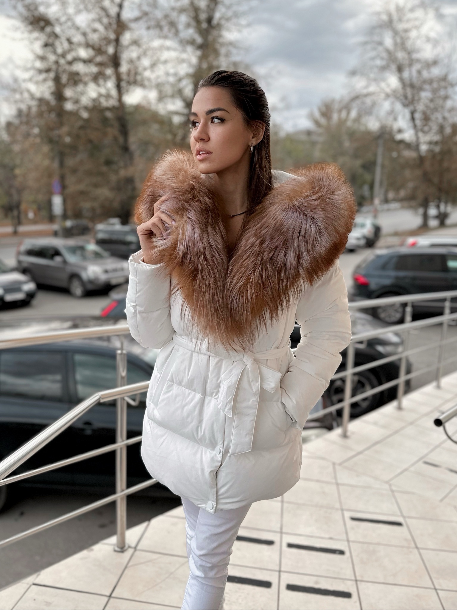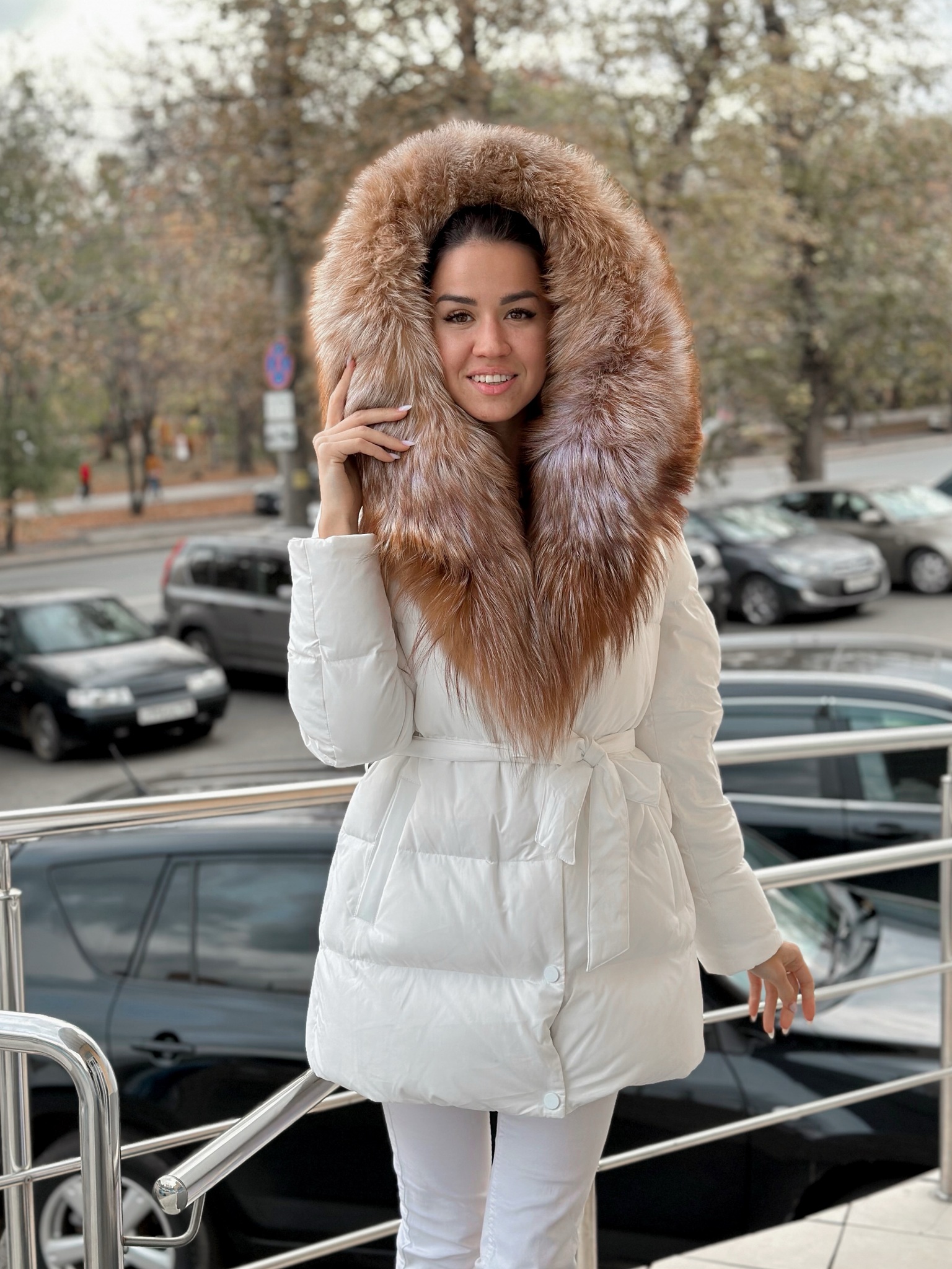 Пуховик с поясом в длине 75см с мехом лисы «огневки»