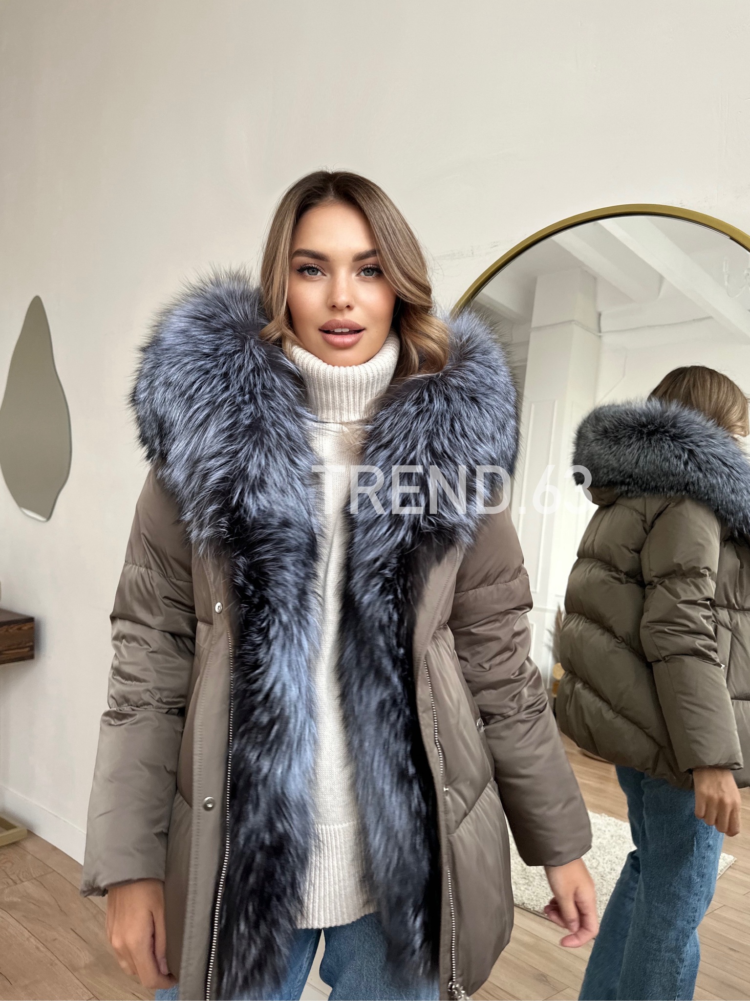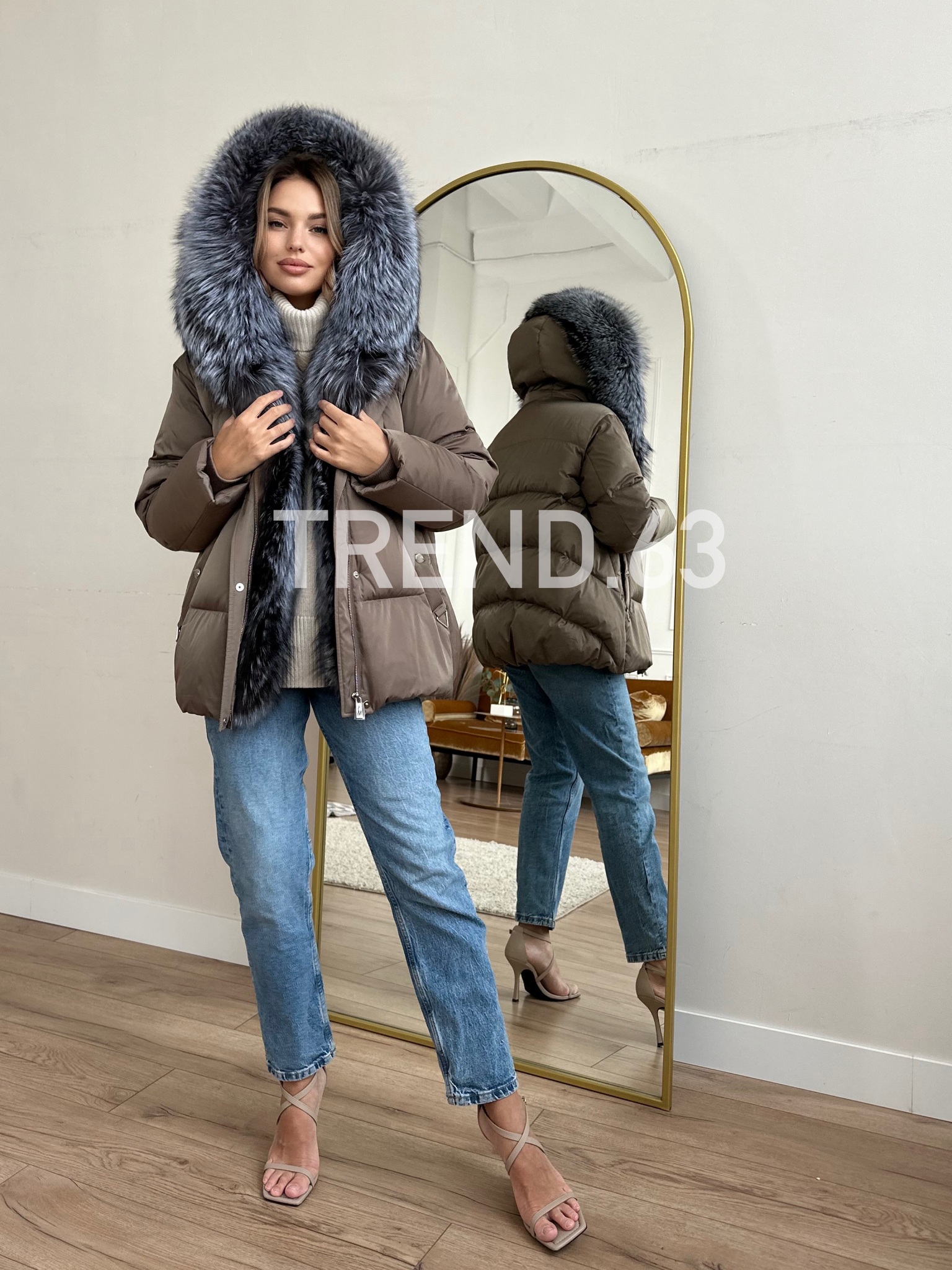 Пуховик в бронзовом цвете с мехом финской чернобурки 75 см