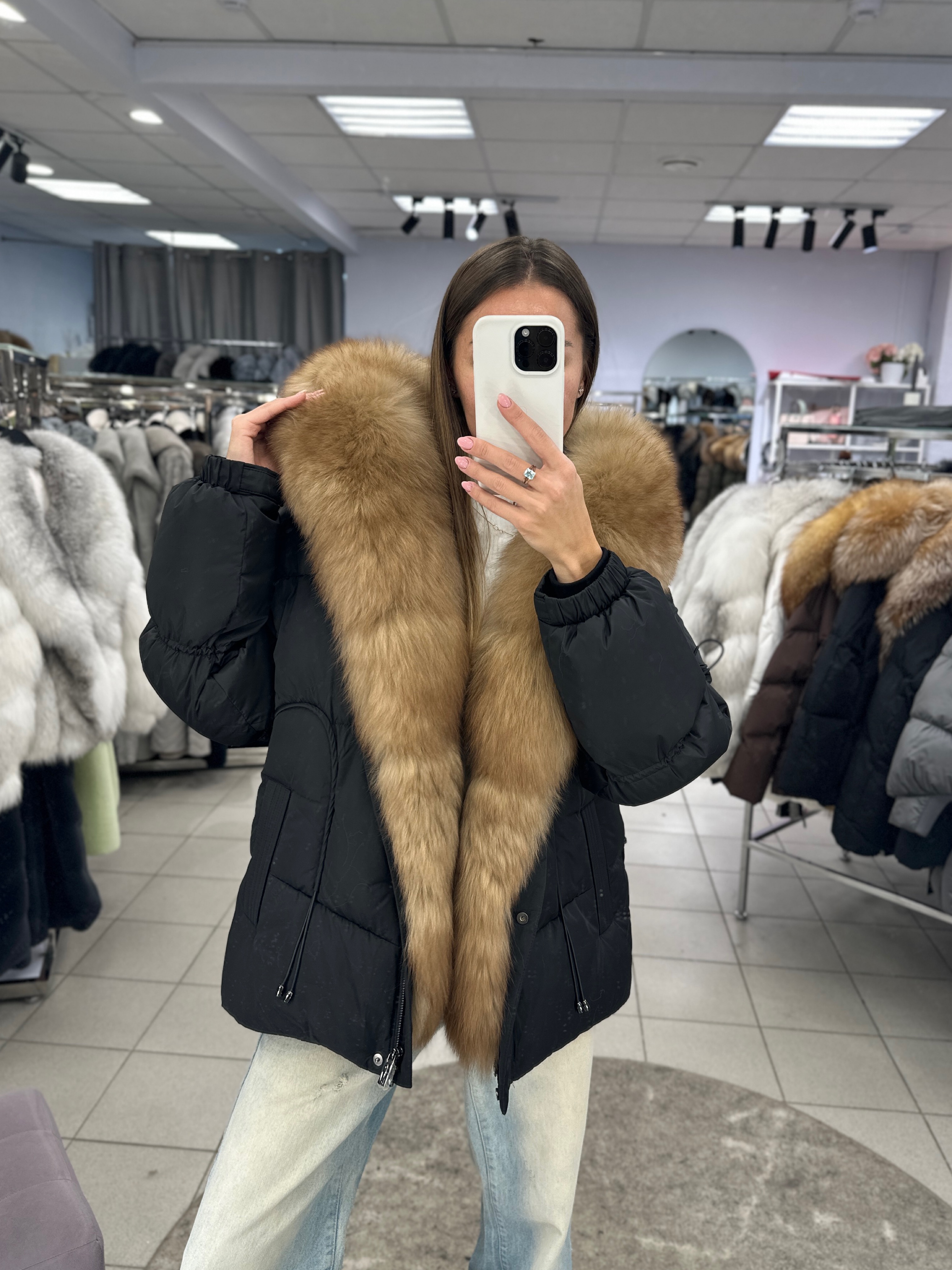 Пуховик в черном цвете с мехом песца под «куницу»