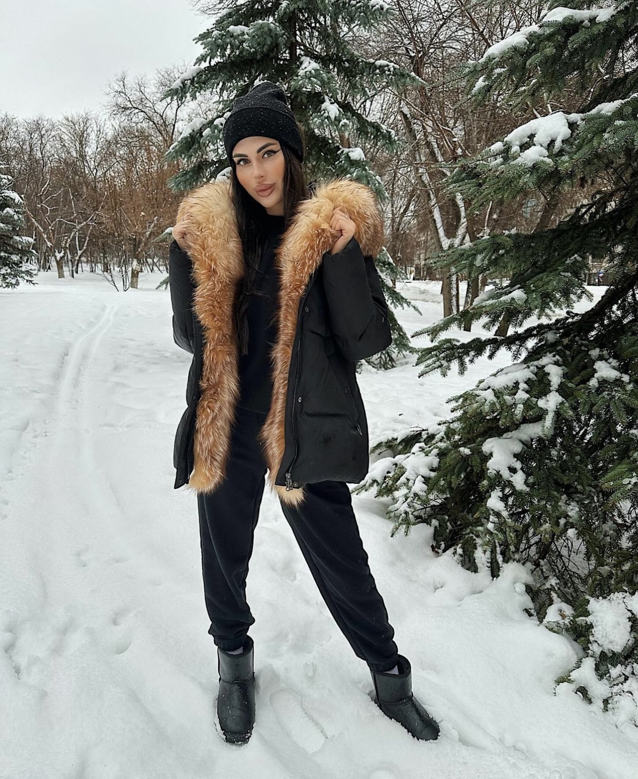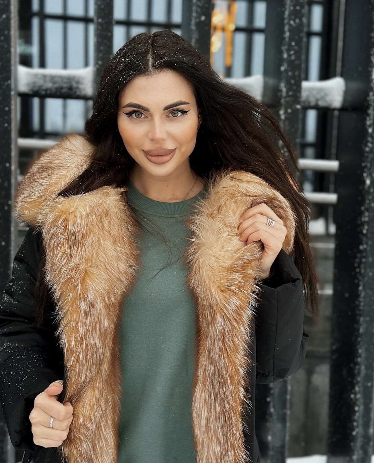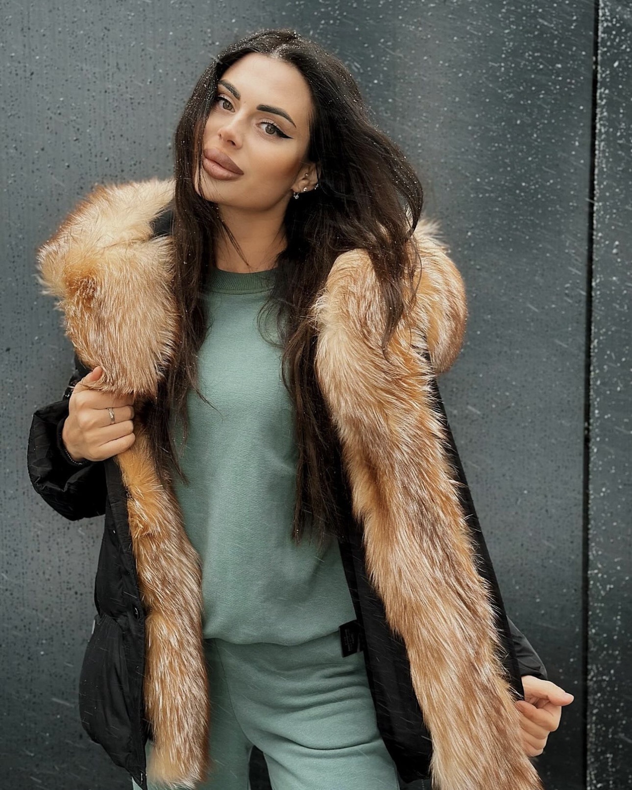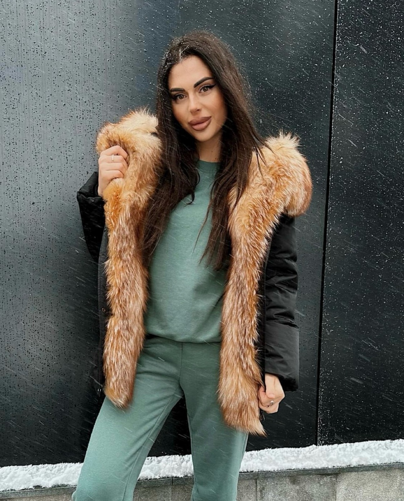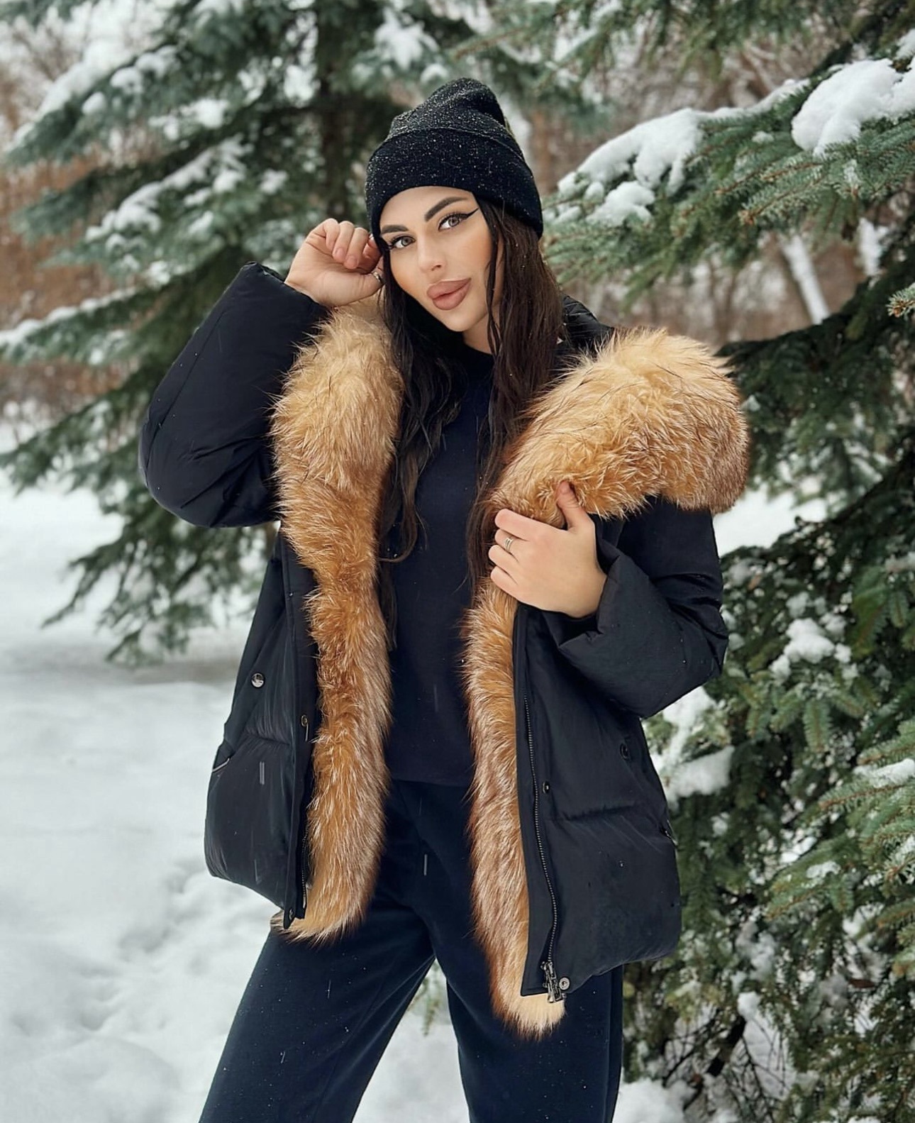 Пуховик в черном цвете с цельным мехом лисы «огневки» 75 см