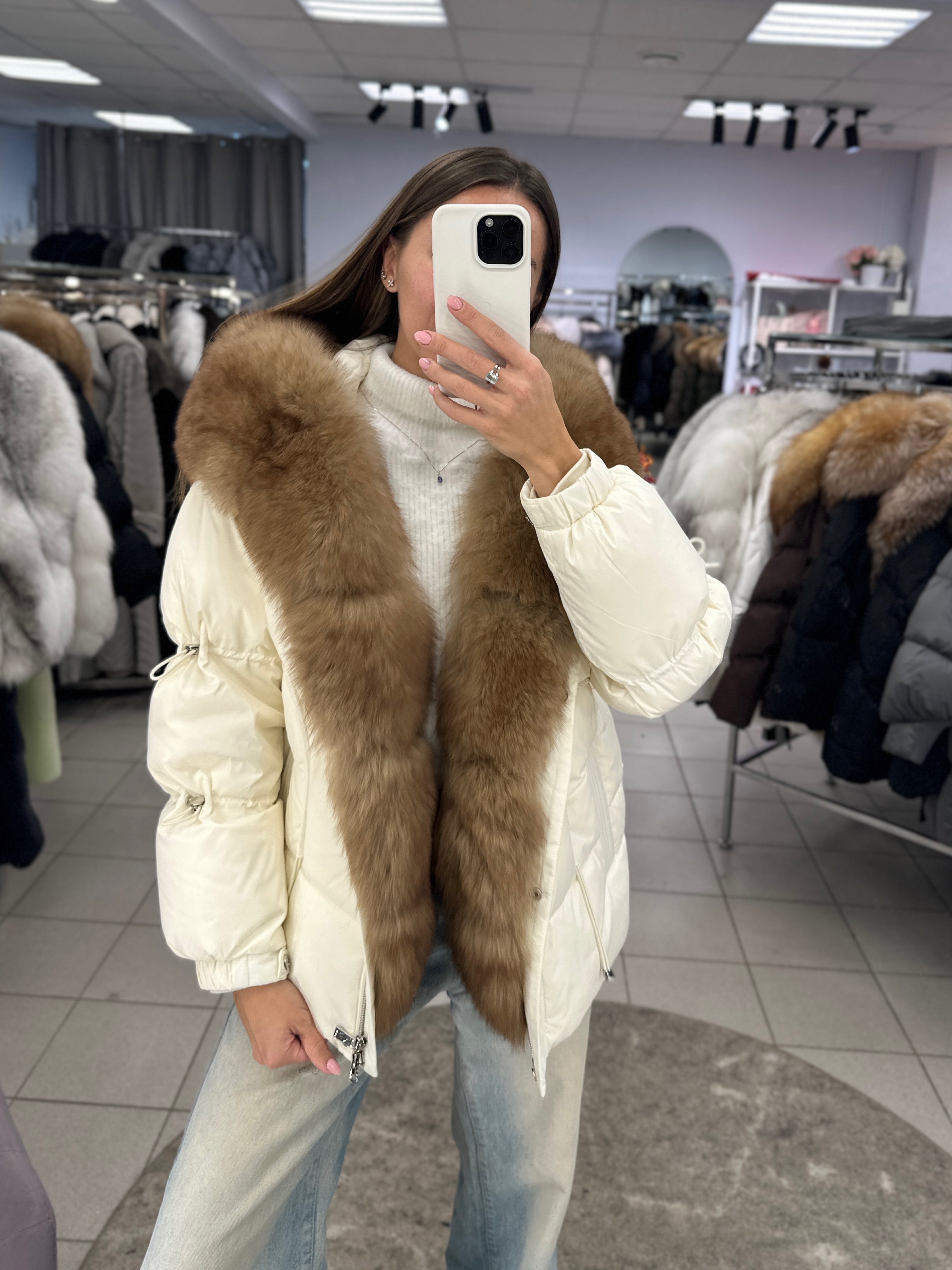 Пуховик в молочном цвете с мехом песца под «куницу»