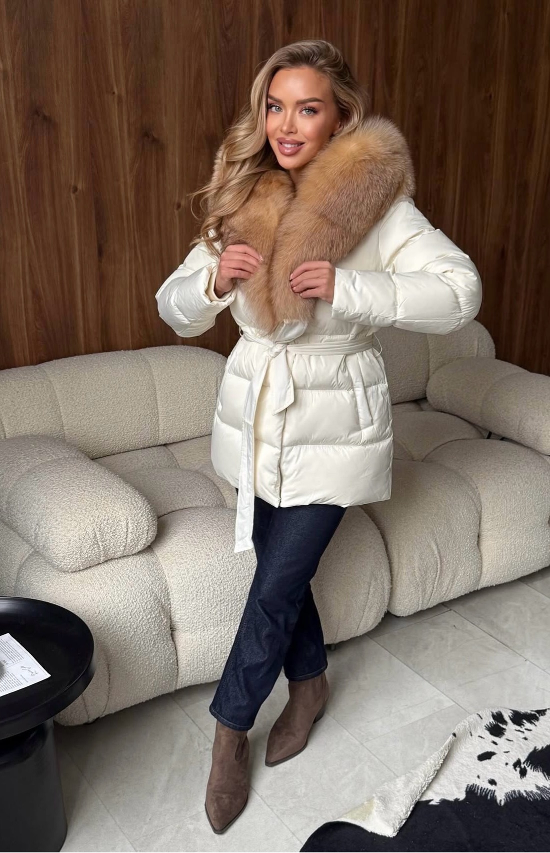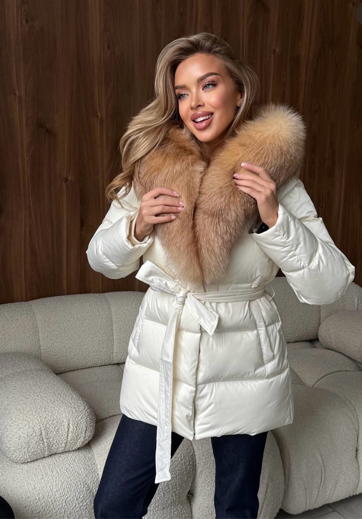 Пуховик в молочном цвете с мехом золотой лисы 75см