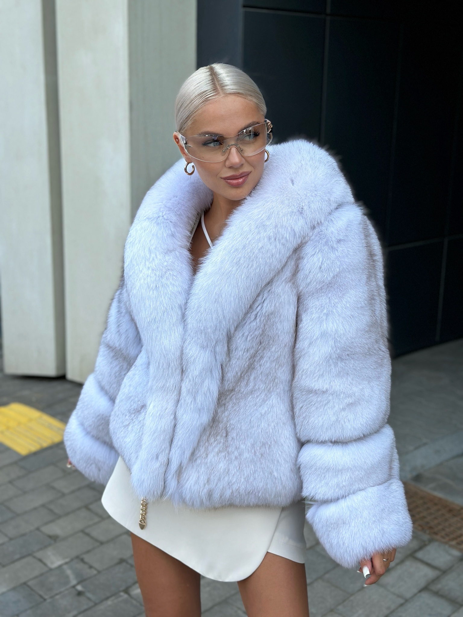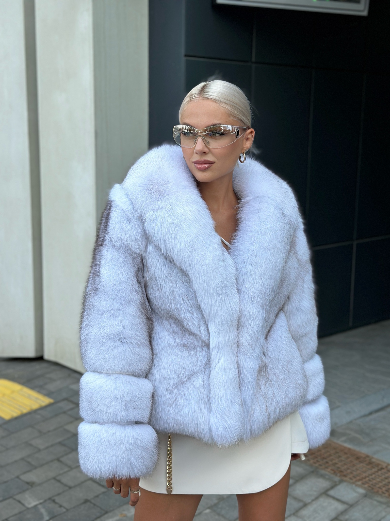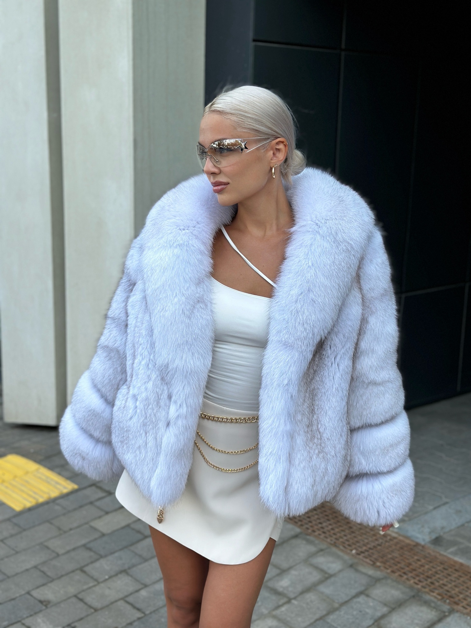 Роскошная шуба из меха финского песца с большим английским воротником в цвете «колотый лед»