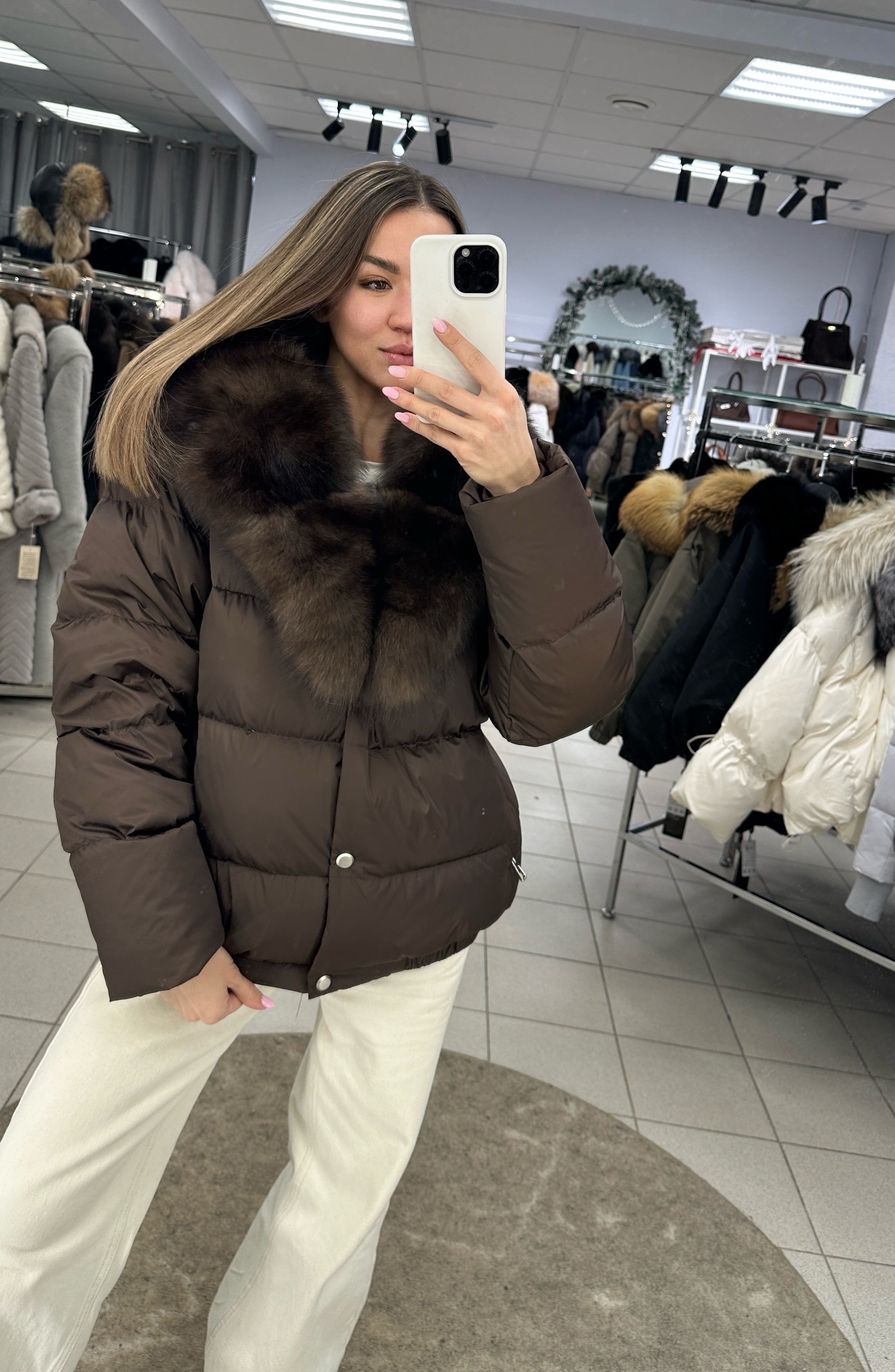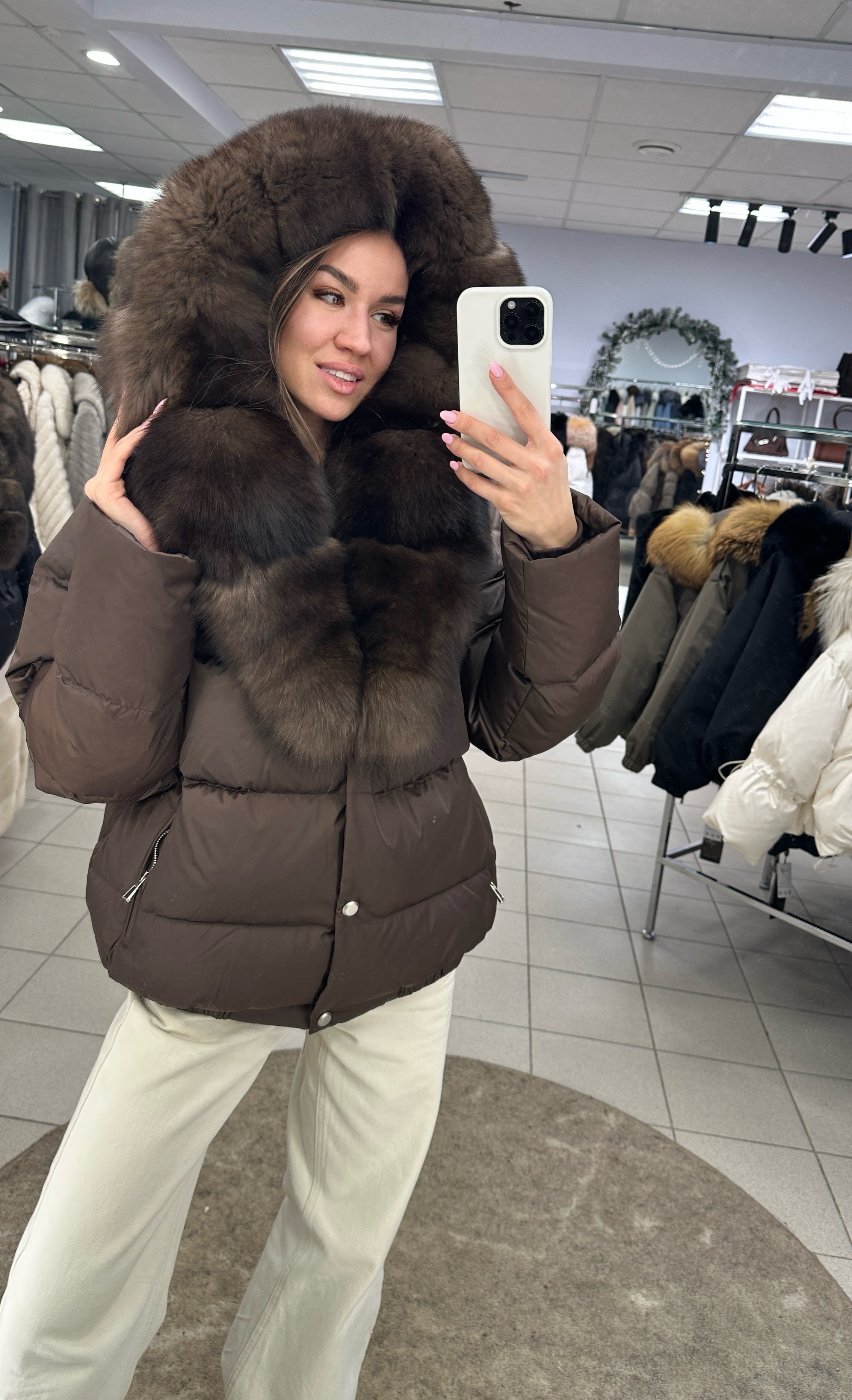 Шоколадный пуховик 60см с мехом финского песца на капюшоне