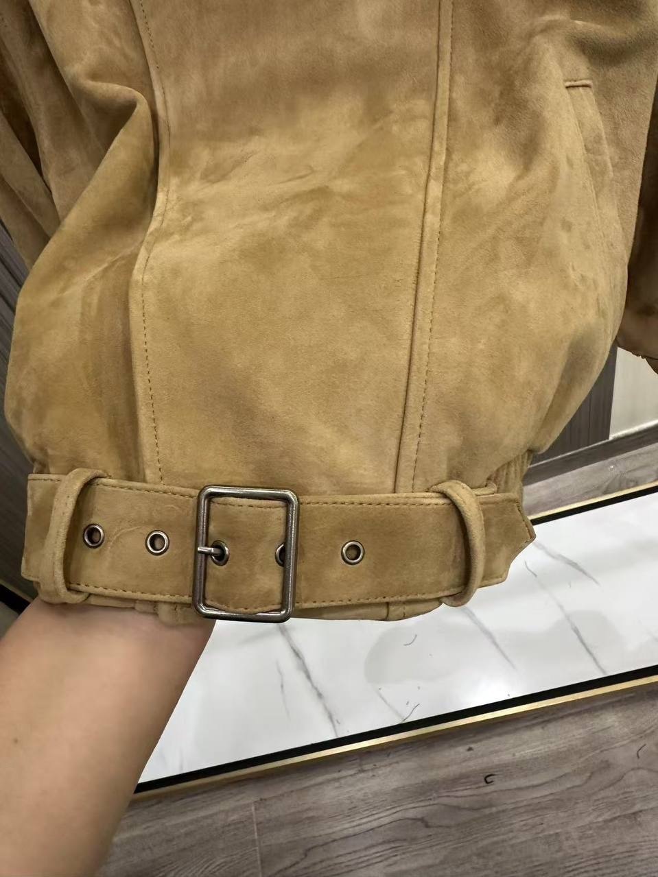 Жакет из замши "белый камень" с английским воротником и поясом
