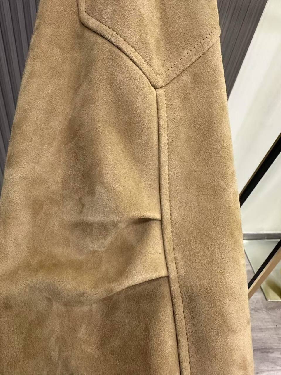 Удлинений бомбер из замши с двойным воротником «карамель»